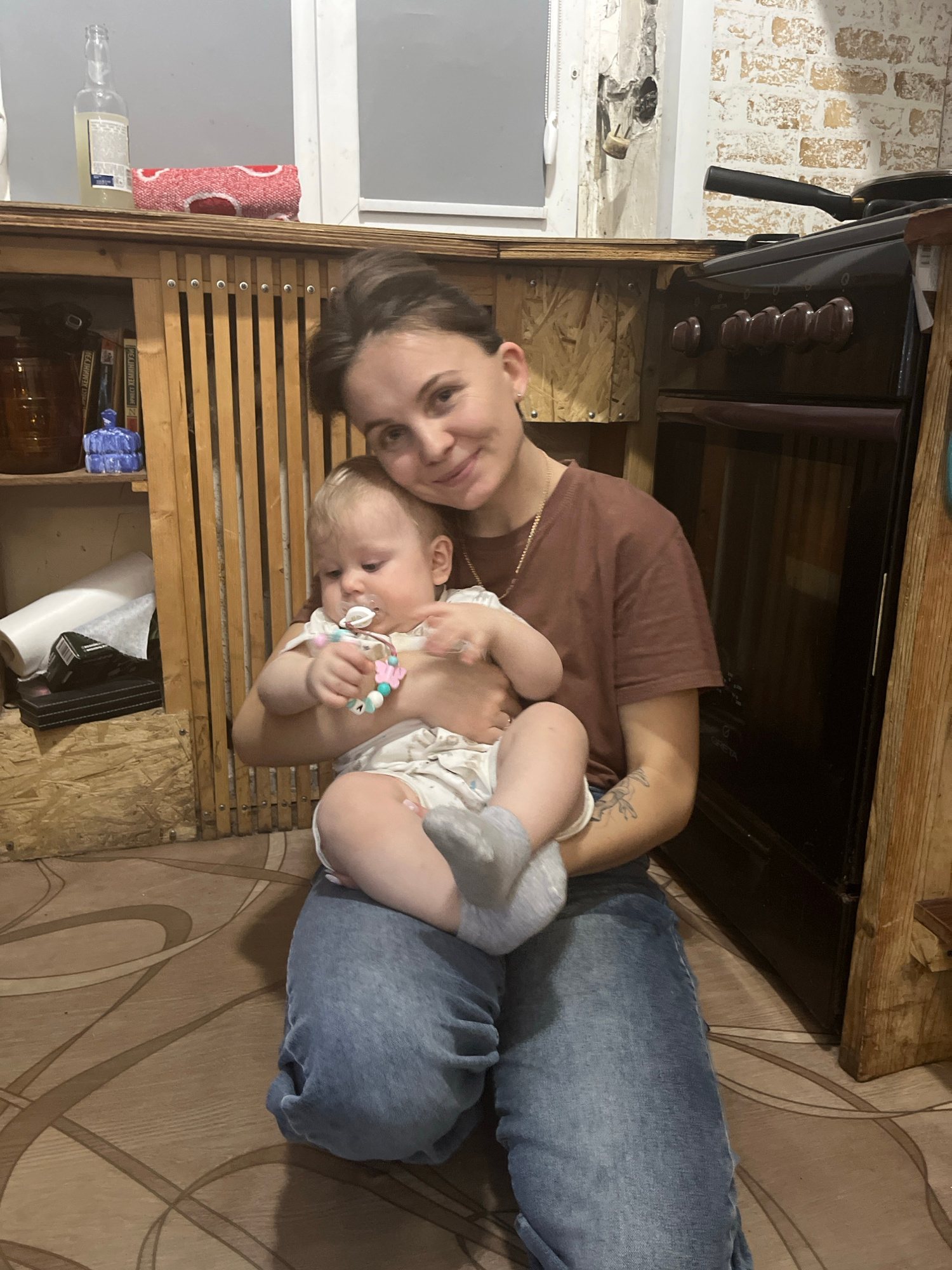Scene: An interior shot shows a woman holding a baby, both indoors. People: A woman with dark hair and a brown shirt is holding a baby. The baby is wearing a white and patterned garment with grey soc…read more