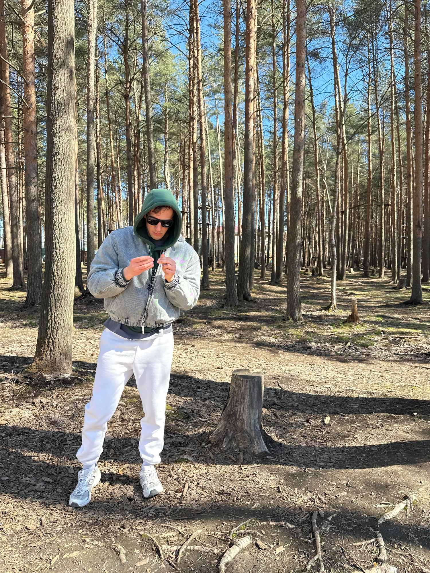 A person wearing sunglasses, a green hoodie, a gray jacket, and white sweatpants stands in a forest of tall pine trees in Murino, Russia. The trees are arranged in a straight row, and the ground is co…read more