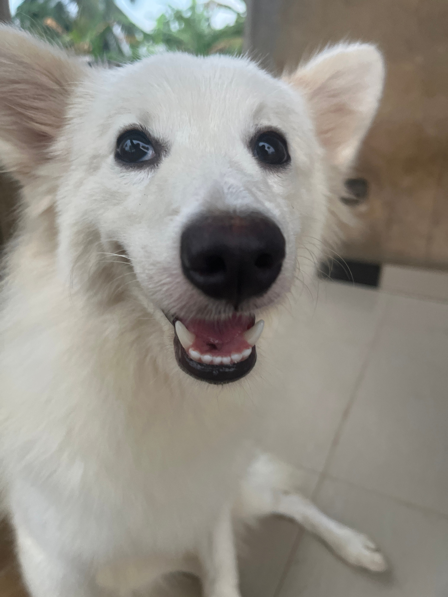A close-up, angled view of a white dog with black eyes and a black nose. The dog's mouth is slightly open, revealing teeth. The background is a light, tiled surface. Greenery is visible in the bottom…read more