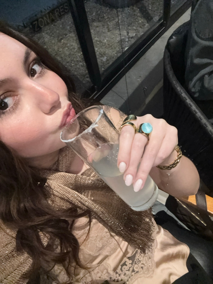 A woman holds a clear glass filled with a light-colored liquid to her lips. She has fair skin, dark hair, and wears rings on her fingers, including a large turquoise one. A gold bracelet adorns her wr…read more