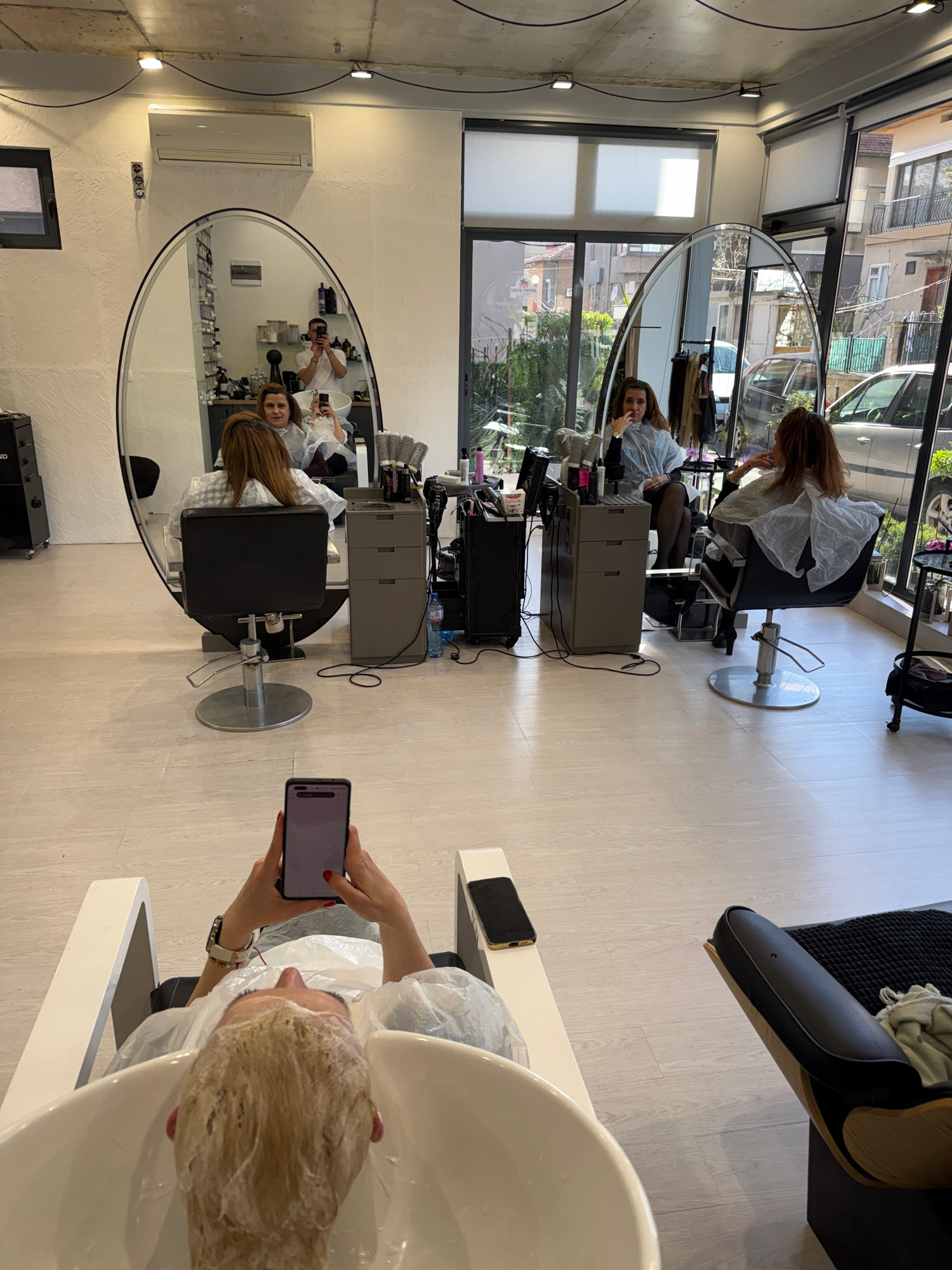 In a hair salon in Blagoevgrad, Bulgaria, a woman with bleached hair sits in a shampoo bowl, covered in a plastic cape. She is holding a smartphone, taking a picture. In the background, a large oval m…read more