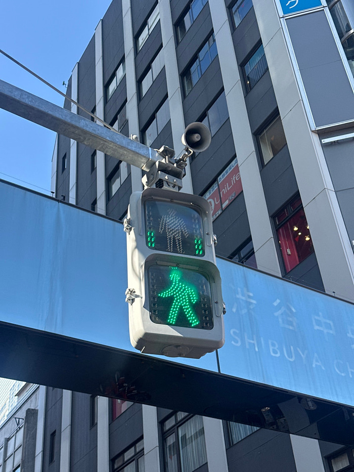 A pedestrian crossing signal shows a green walking figure on the right, indicating it is safe to cross. The left signal displays a faded, almost invisible walking figure. The signal is mounted on a gr…read more