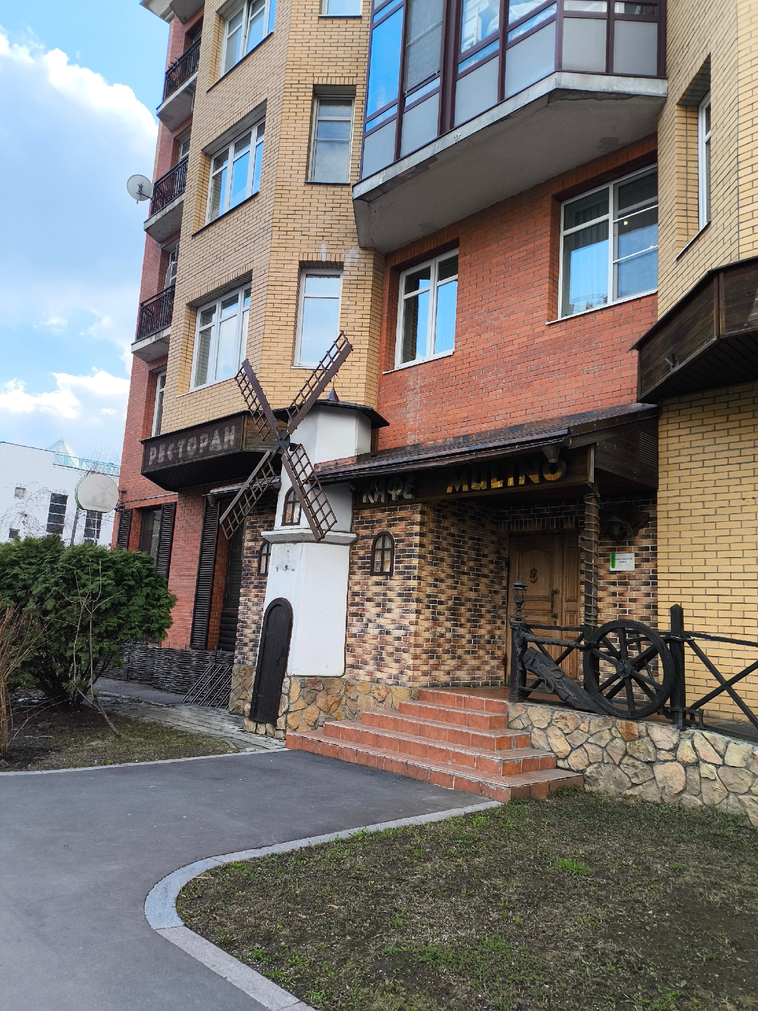 The image depicts a multi-story building in Moscow, Russia, featuring a restaurant called "Cafe Mulino" designed with a windmill motif. The building's facade is a mix of brick and stone, with varying…read more