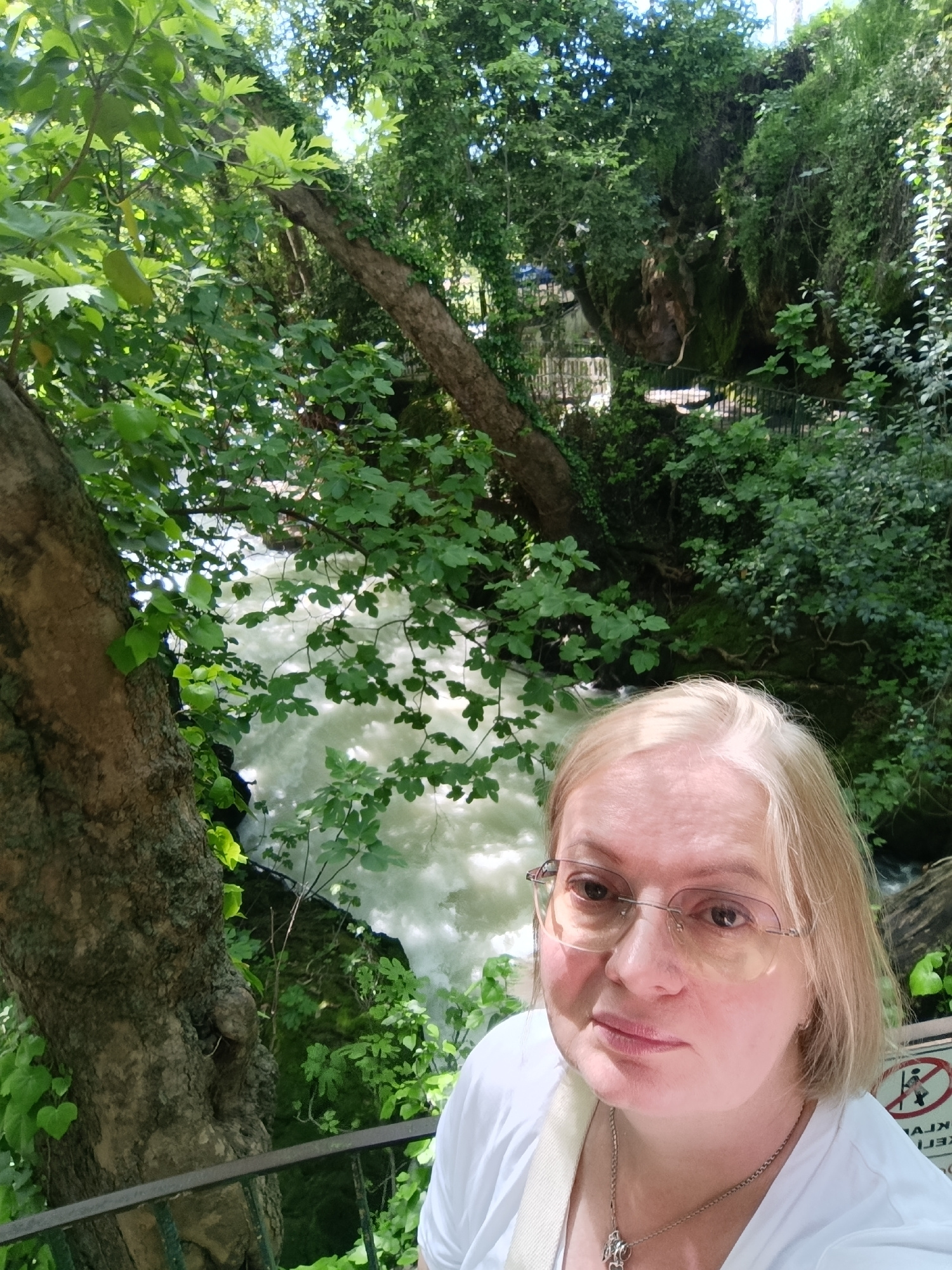 The image is a selfie taken outdoors, featuring a mature woman with blonde hair, wearing glasses and a white t-shirt. A silver necklace is visible around her neck. She appears to be positioned on a pl…read more