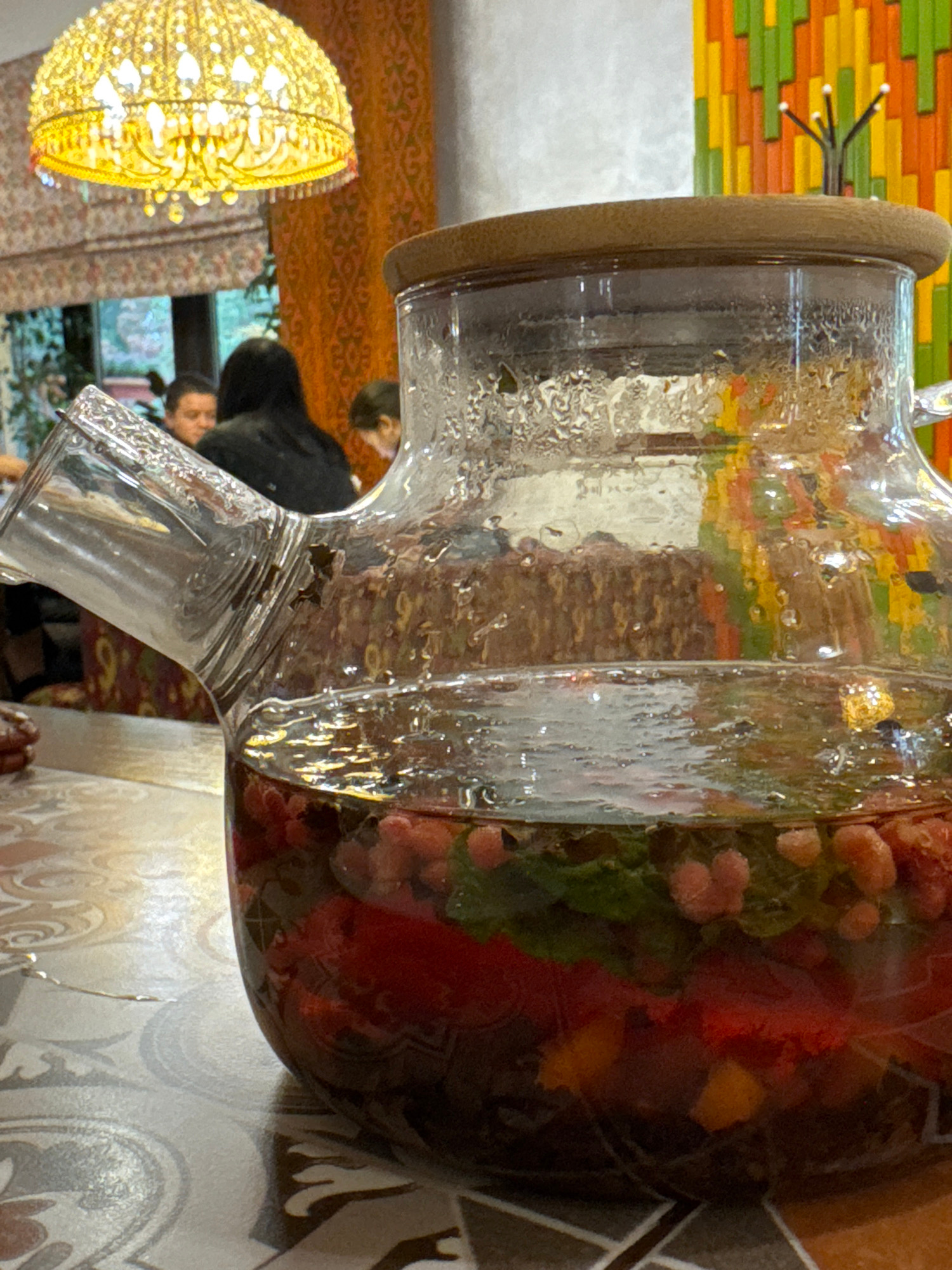 This media file features a large, clear glass pitcher filled with a colorful fruit-infused beverage, positioned on a patterned tabletop. The pitcher shows condensation, indicating the drink is cold. I…read more