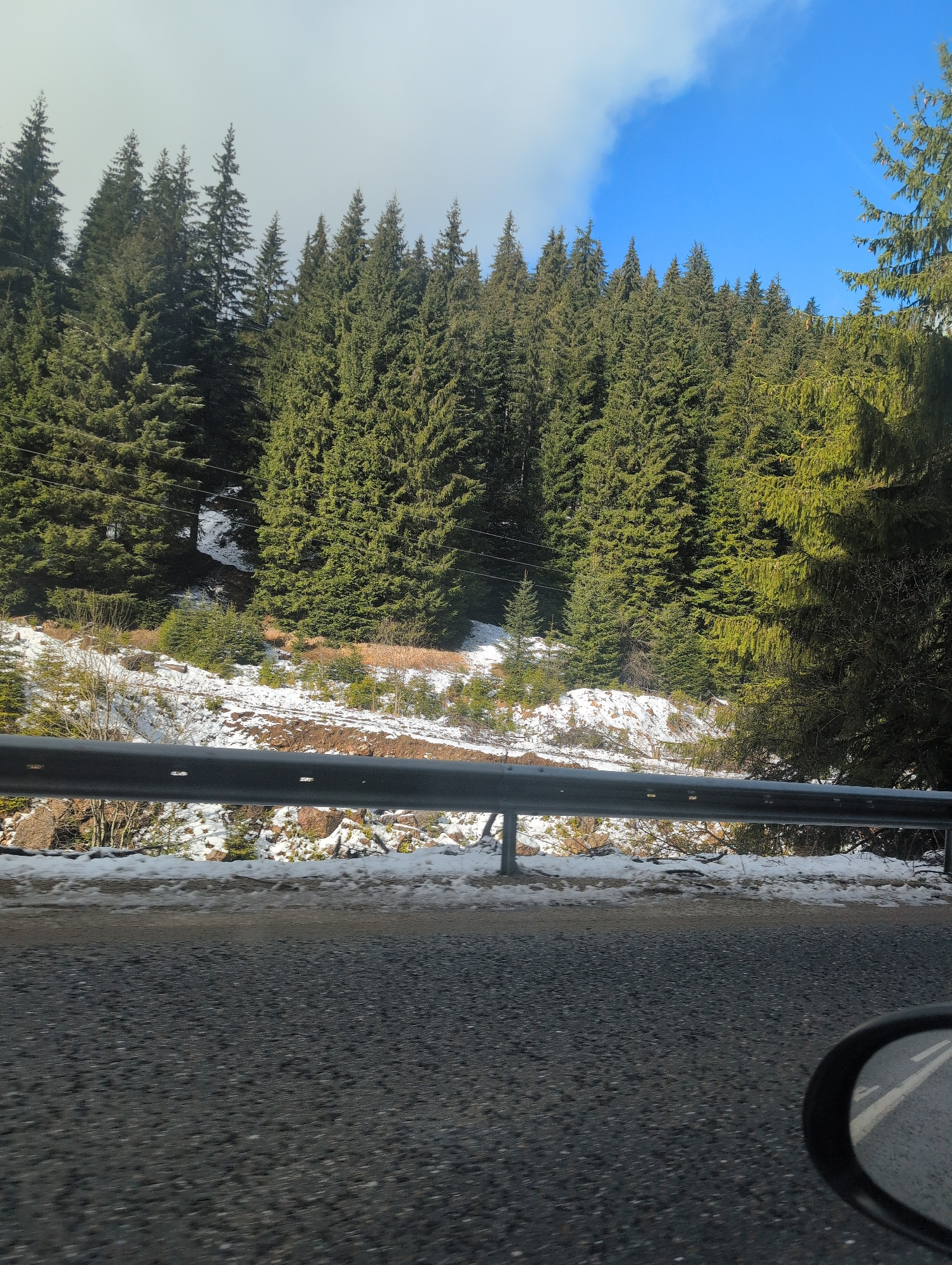The image depicts a roadside scene in Progled, Bulgaria, as observed from a vehicle. A dark asphalt road occupies the lower portion of the frame, bordered by a metal guardrail. Beyond the guardrail, a…read more