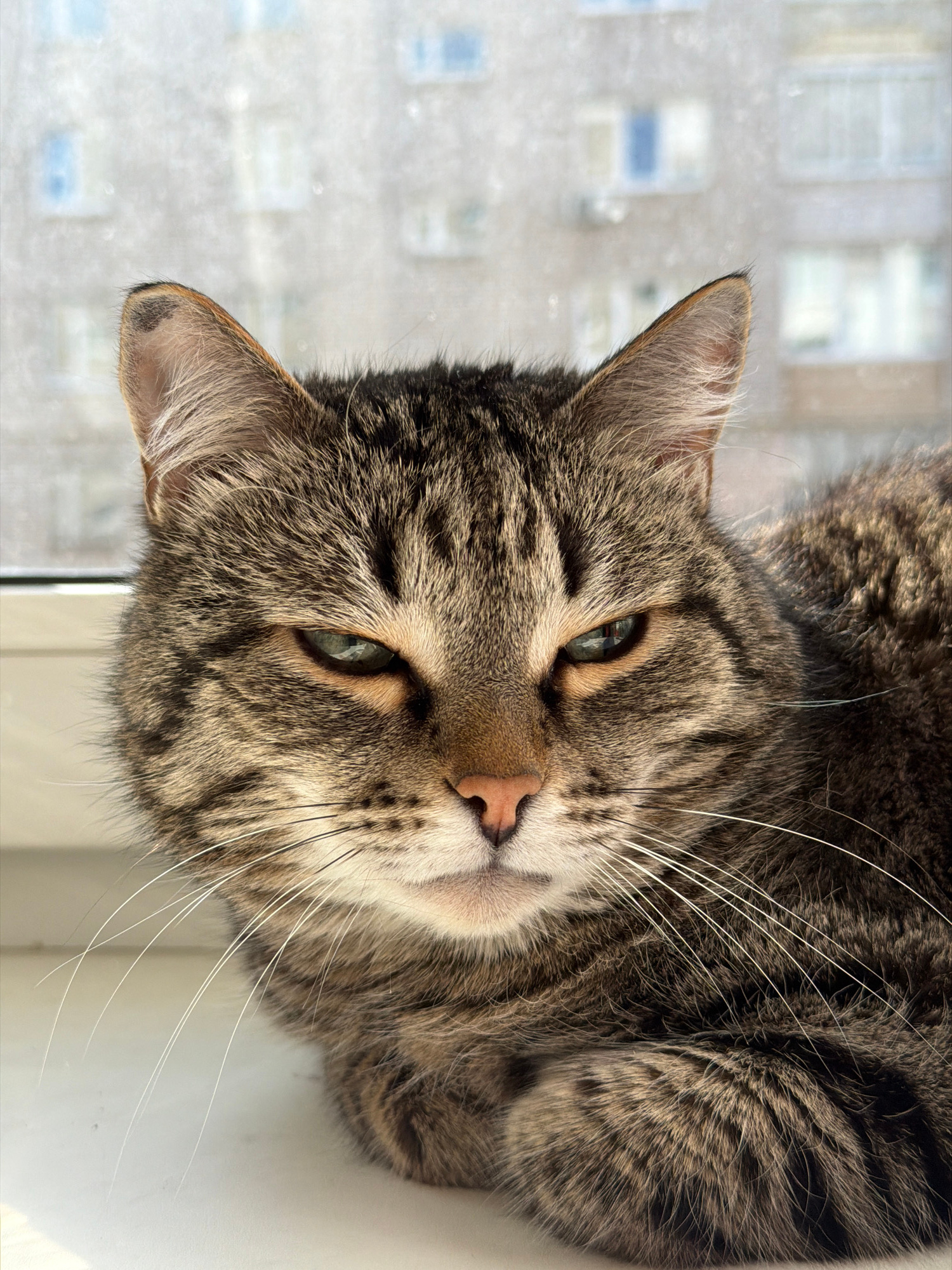 A tabby cat is lying on its side, likely on a windowsill, and looking at the camera. The cat has a mottled grey and brown coat with stripes and swirls. It has green eyes, a pink nose, and white whiske…read more
