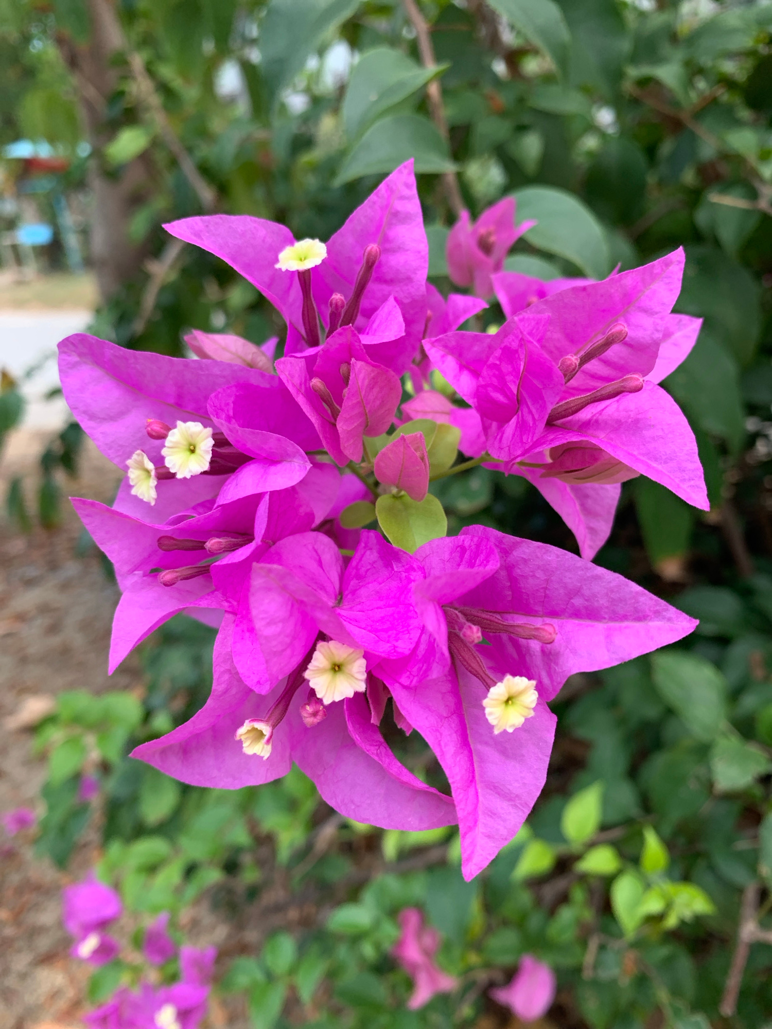 The image shows a close-up of a cluster of magenta bougainvillea flowers with small white and yellow centers. The flowers are surrounded by green foliage, suggesting they are part of a larger bush or…read more