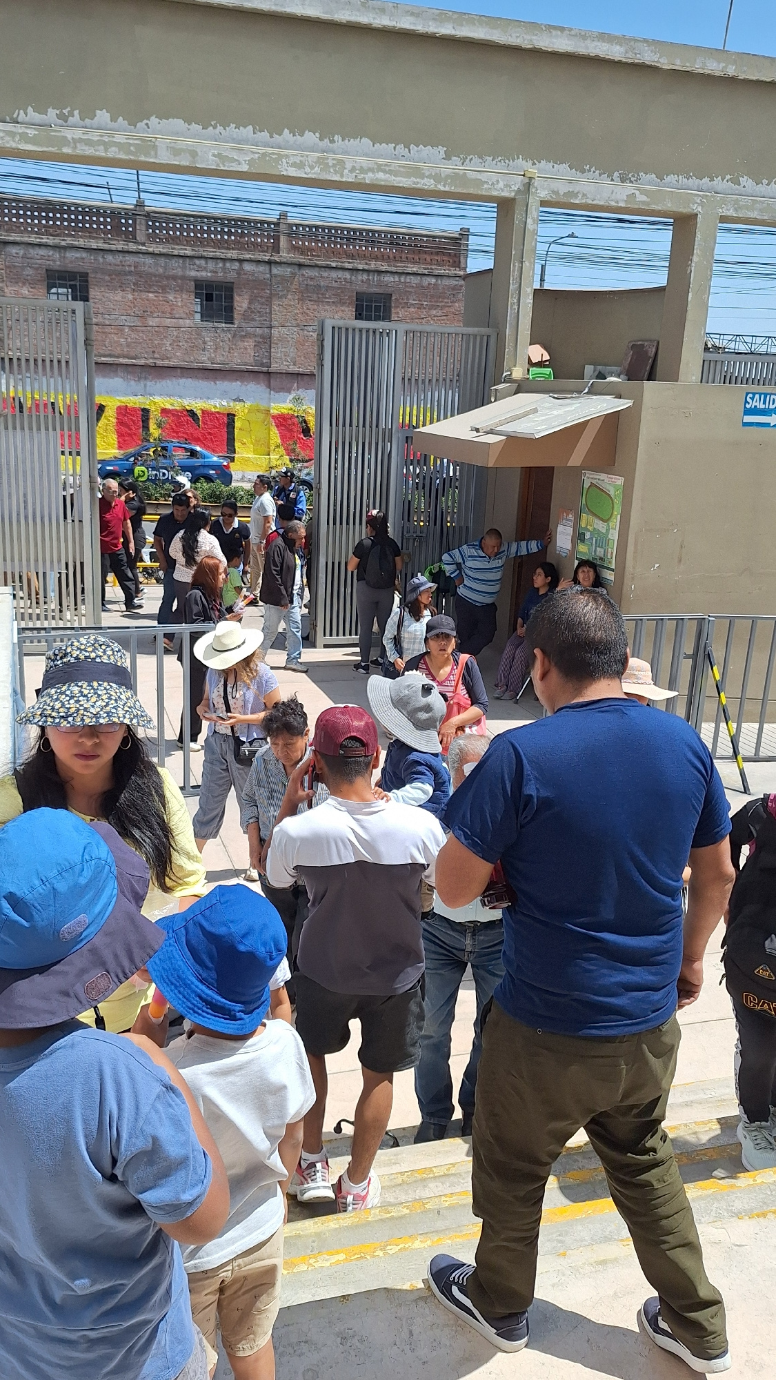 The image shows a group of people in Arequipa, Peru, gathered near a building with a weathered exterior. Several individuals are sitting or crouching in the foreground, wearing hats and casual clothinβ¦read more