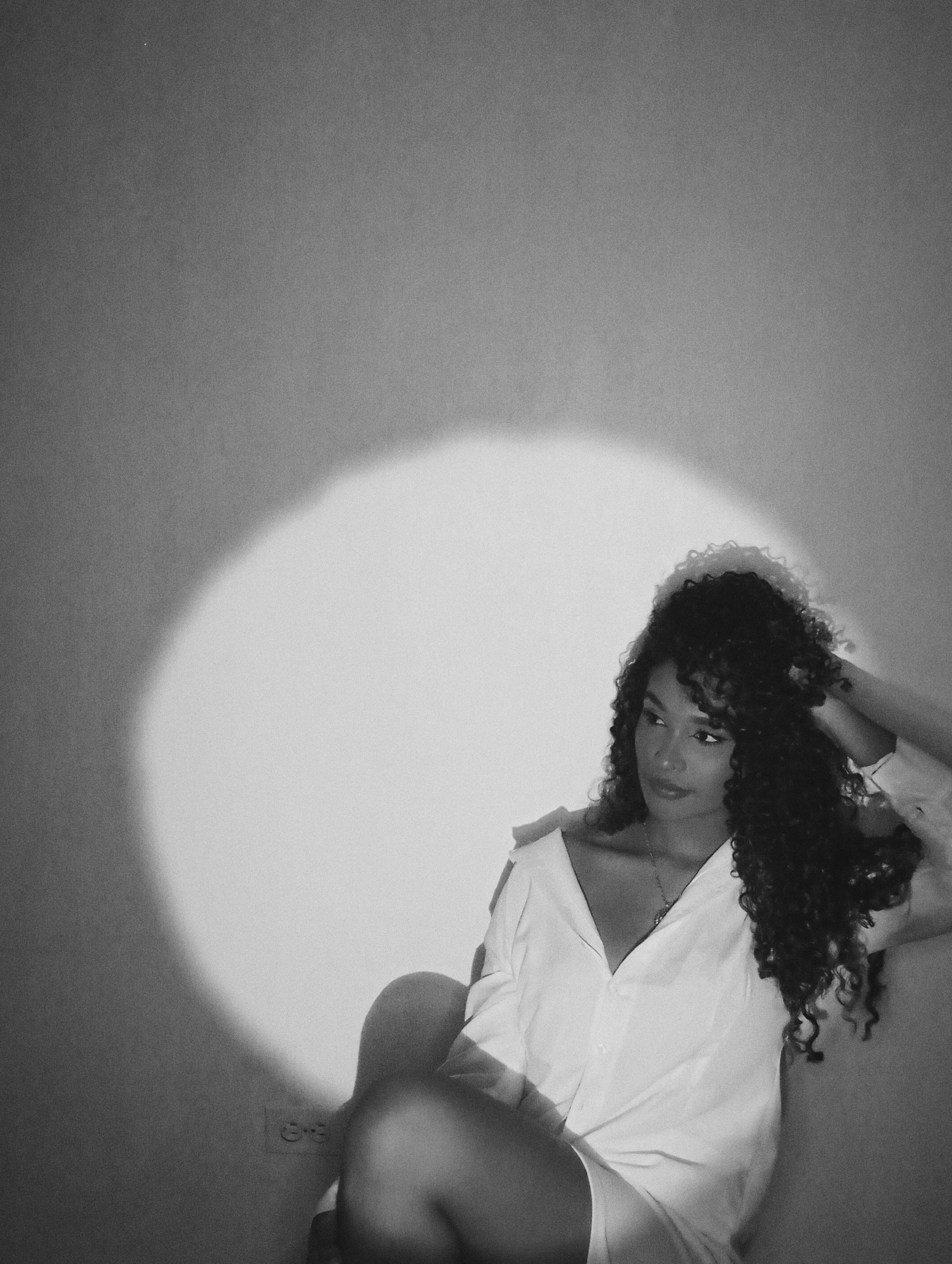 A black and white, indoor shot features a woman with curly hair, wearing a white shirt and shorts. She is positioned in front of a wall with a circular spotlight cast upon it. The woman is seated, wit…read more