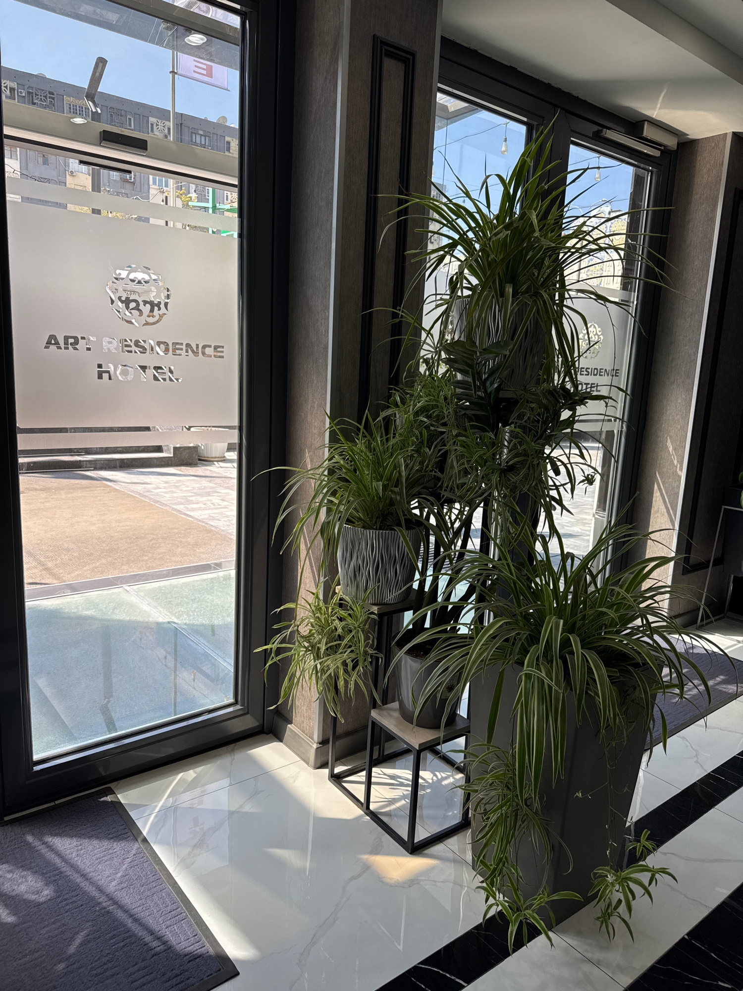 A low-angle view from inside a building, possibly a hotel lobby, looking out through a glass-paneled entryway. The entryway displays "Art Residence Hotel" in white lettering. Outside the glass, blurre…read more