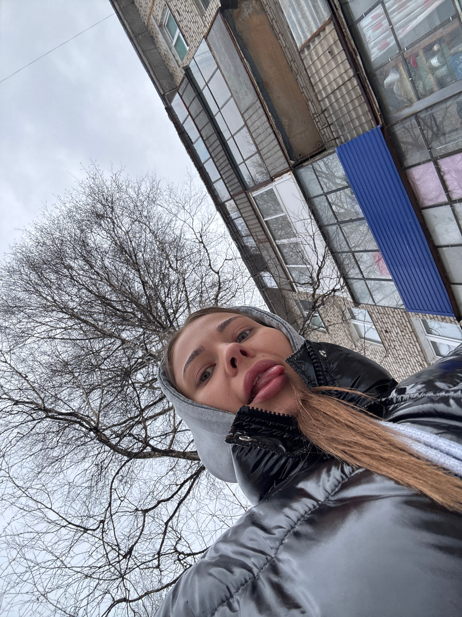 A photograph depicts a woman wearing a grey hooded jacket, with her tongue extended towards the camera. The image is taken from a low angle, with a building complex visible in the upper portion, marke…read more