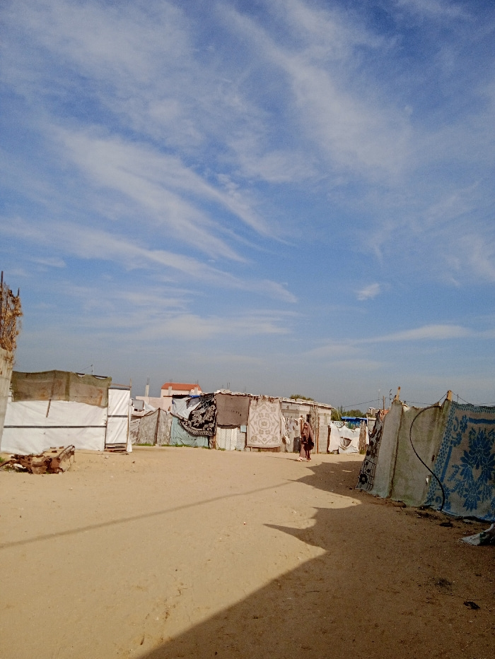 The image depicts an informal settlement in Khan Yunis, Palestinian Territory, under a bright blue sky with wispy white clouds. A wide, unpaved dirt path, light brown in color, occupies the foreground…read more