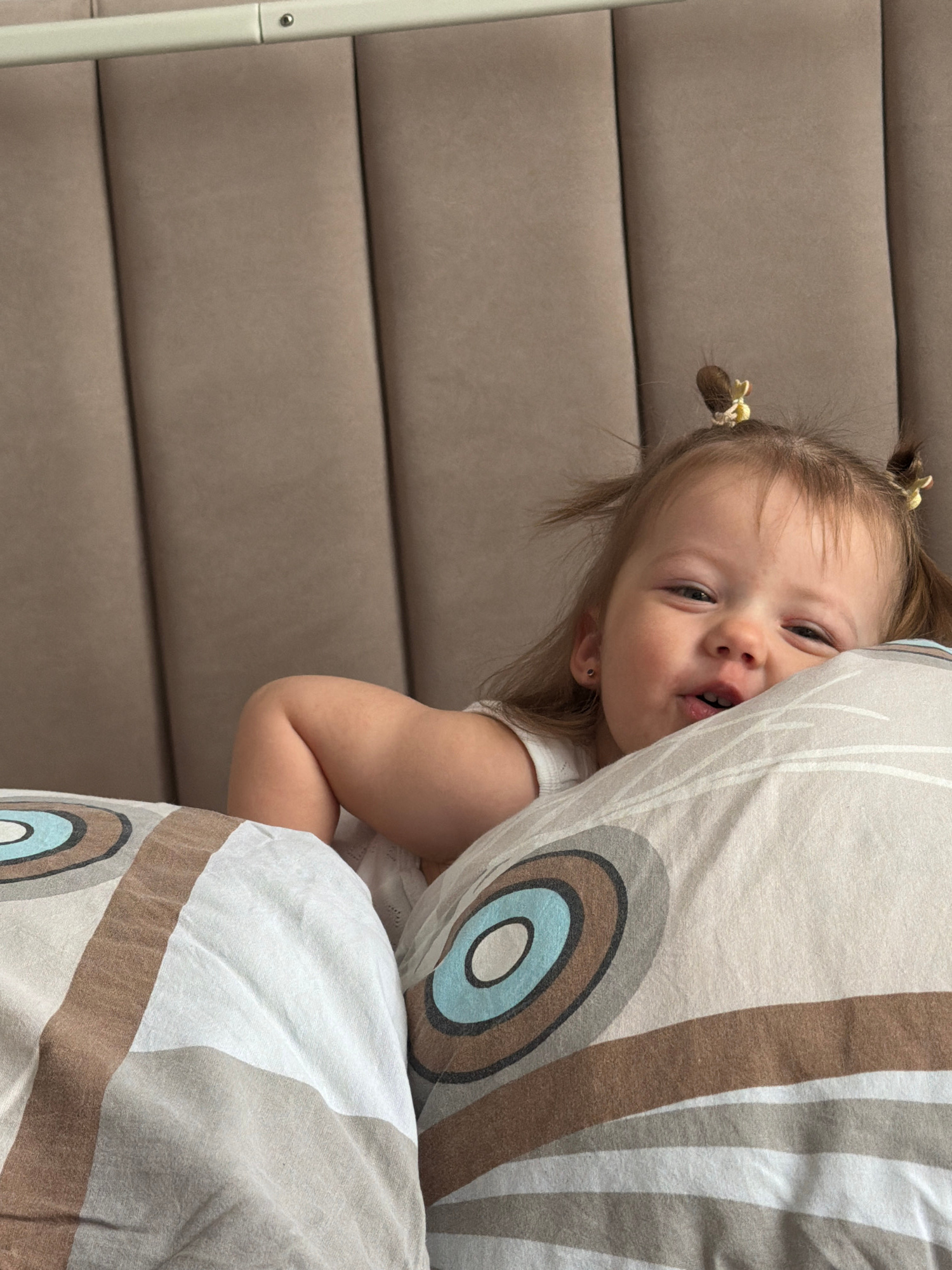 A close-up, eye-level shot shows a young girl with blonde hair styled in two pigtails, partially obscured by a patterned pillow. The girl's face is visible, revealing a playful expression with an open…read more