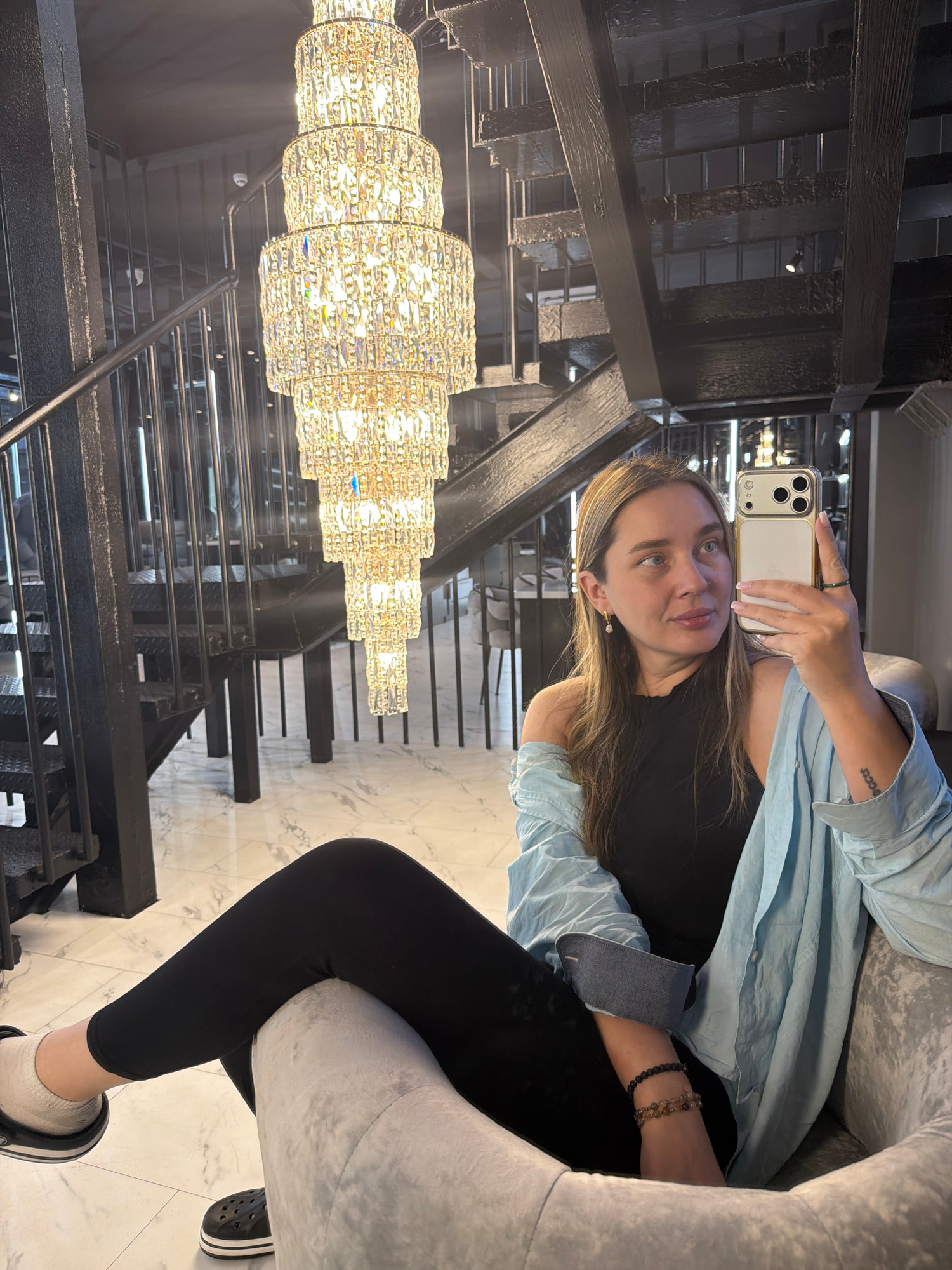 A woman sits in a gray upholstered chair. She wears black leggings, a black top, and a light blue shirt. She holds a white smartphone to take a photo. Behind her is a black metal staircase with a larg…read more