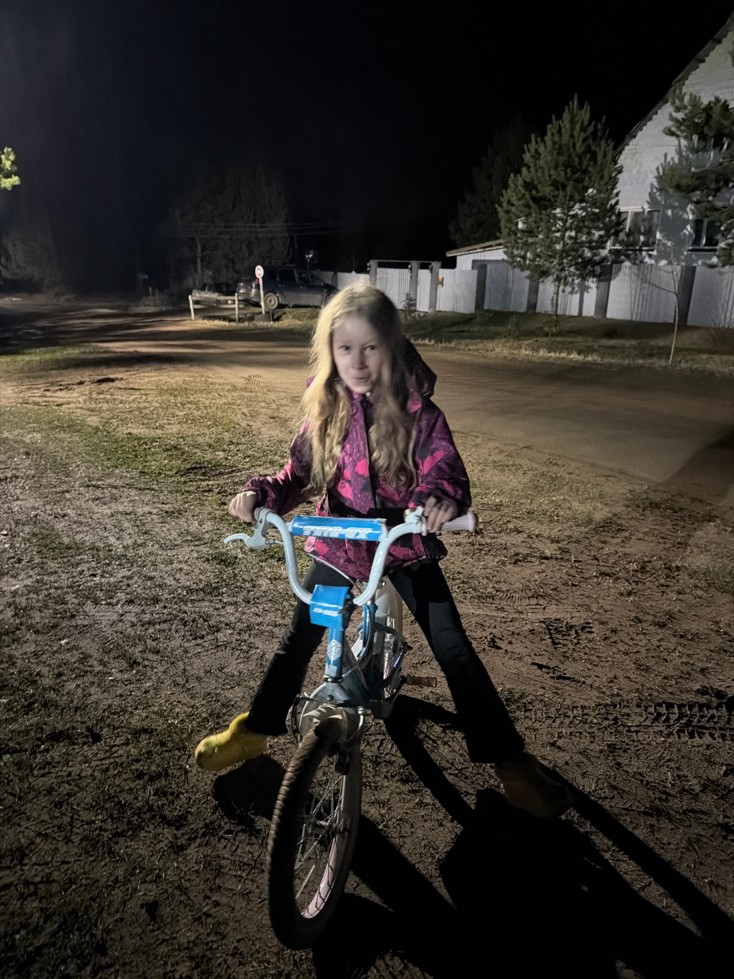 The photograph shows a young person on a bicycle at night. The individual is wearing a dark-colored hooded jacket with a pink and magenta pattern, dark leggings, and light yellow shoes. They are holdi…read more