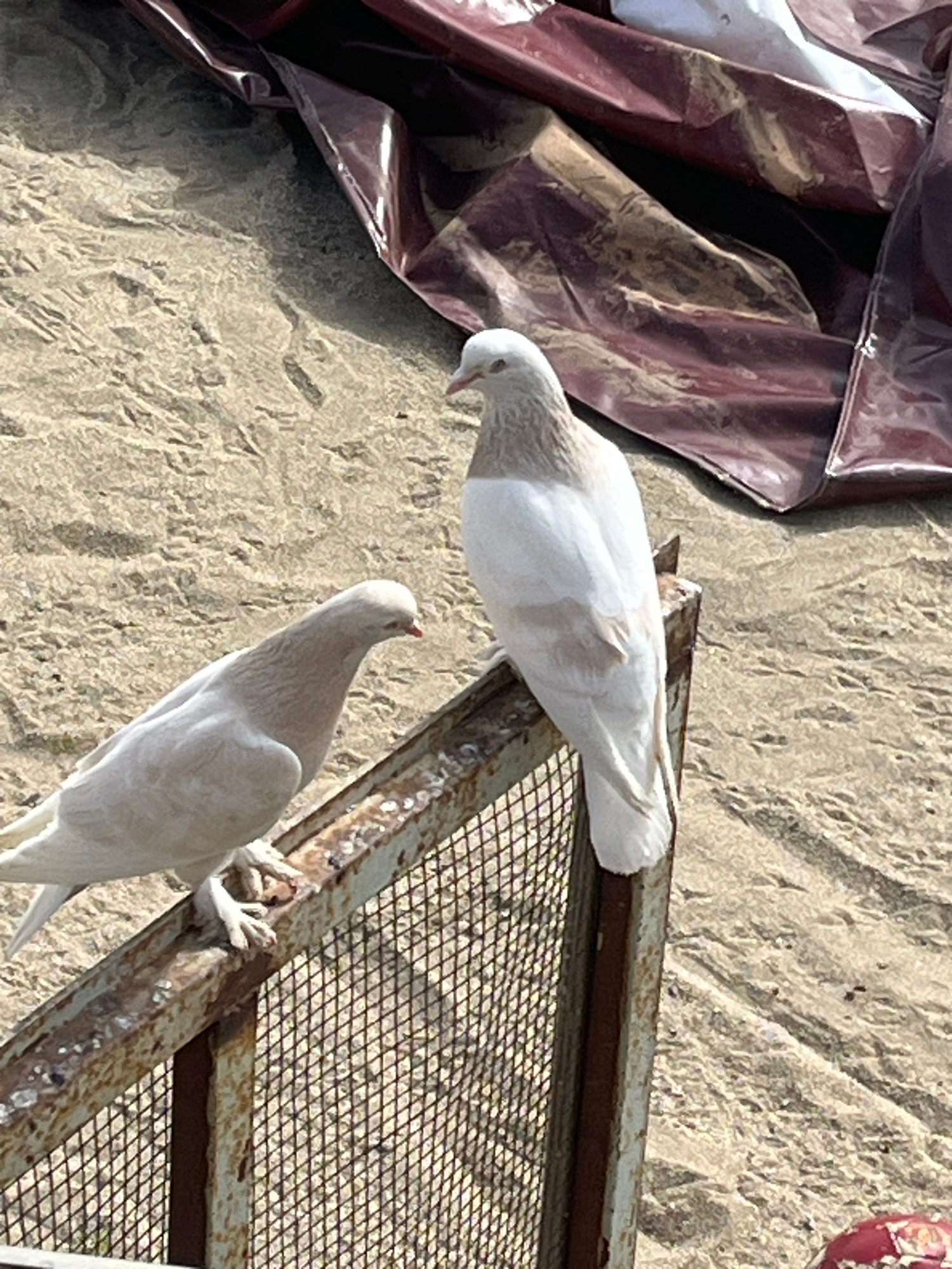 Two white doves perch on a rusted metal structure. One dove stands on the metal grid, while the other rests on a higher, adjacent metal bar. Next to them is a crumpled, maroon-colored plastic tarp. Th…read more