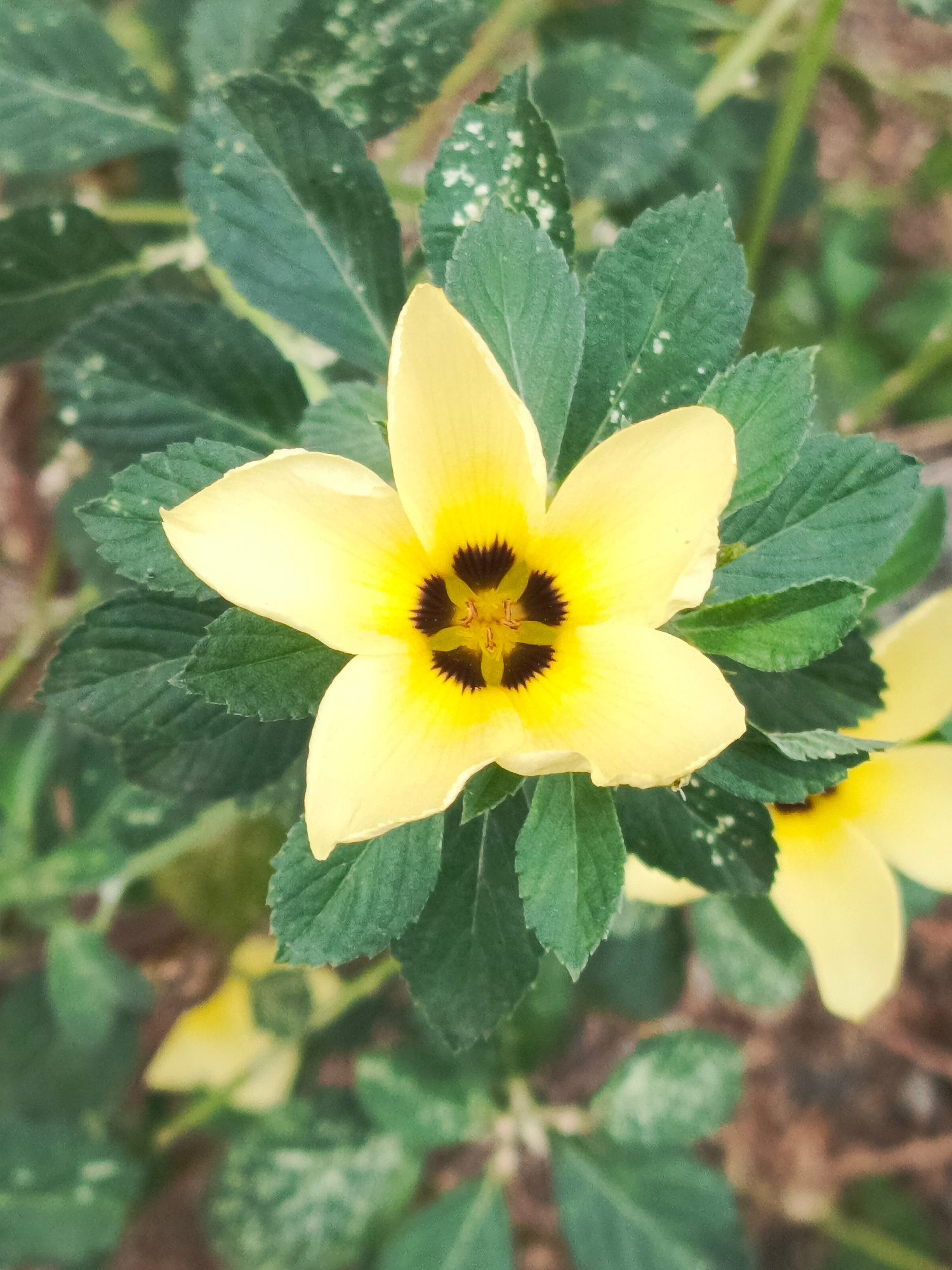 A close-up shot shows a yellow Turnera ulmifolia flower with a black and brown center, surrounded by green leaves. The location is Tinaco, Venezuela. Another flower is partially visible in the lower r…read more