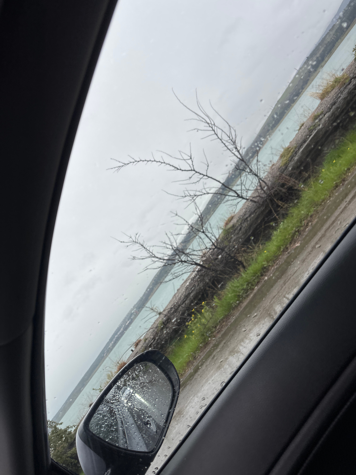 The image shows a view from inside a car, looking out the passenger-side window. Raindrops are visible on the window and side mirror. A leafless tree is in the foreground, with greenery and a body ofโฆread more