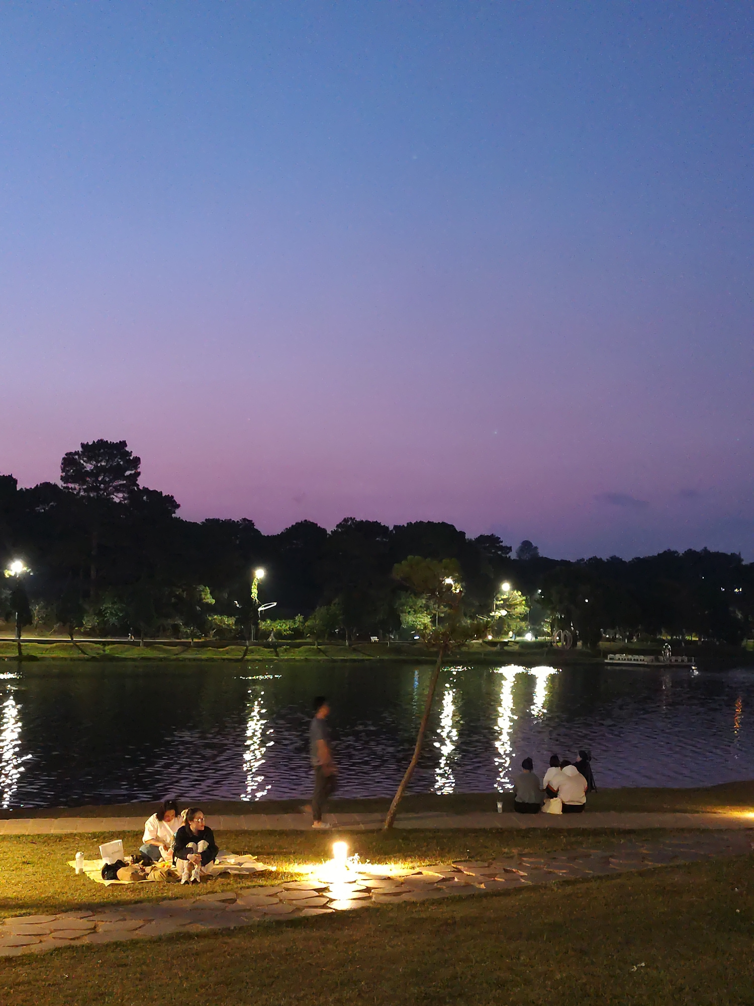 At dusk in Da Lat, Vietnam, a group of people are scattered along the edge of a lake, likely Xuan Huong Lake. In the foreground to the left, two women are sitting on a blanket on the grass, possibly p…read more