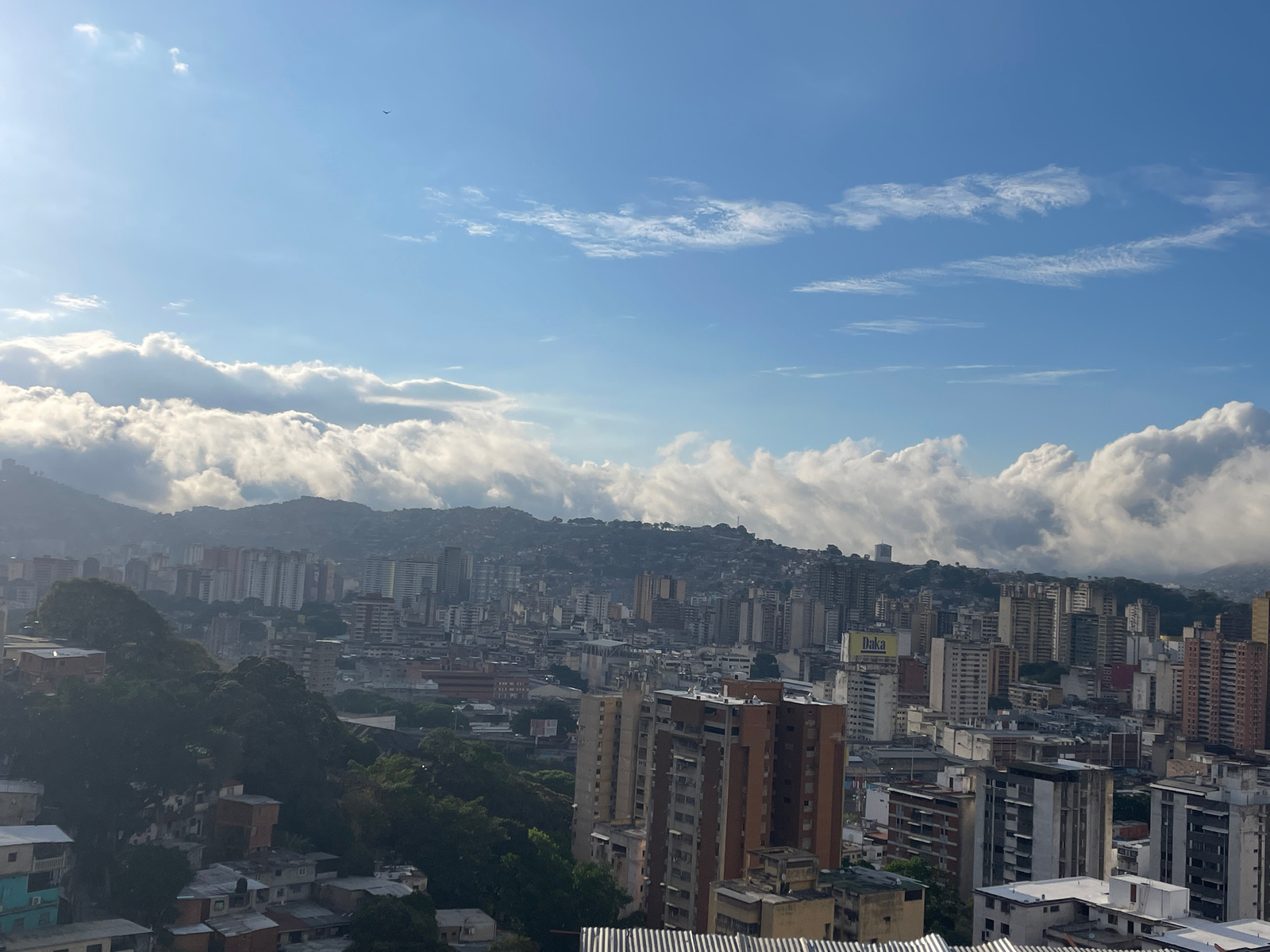 The image depicts a broad daytime cityscape of Caracas, Venezuela, under a sky of bright blue mottled with white clouds. A range of buildings, mostly high-rise apartments, stretch across the view. In…read more
