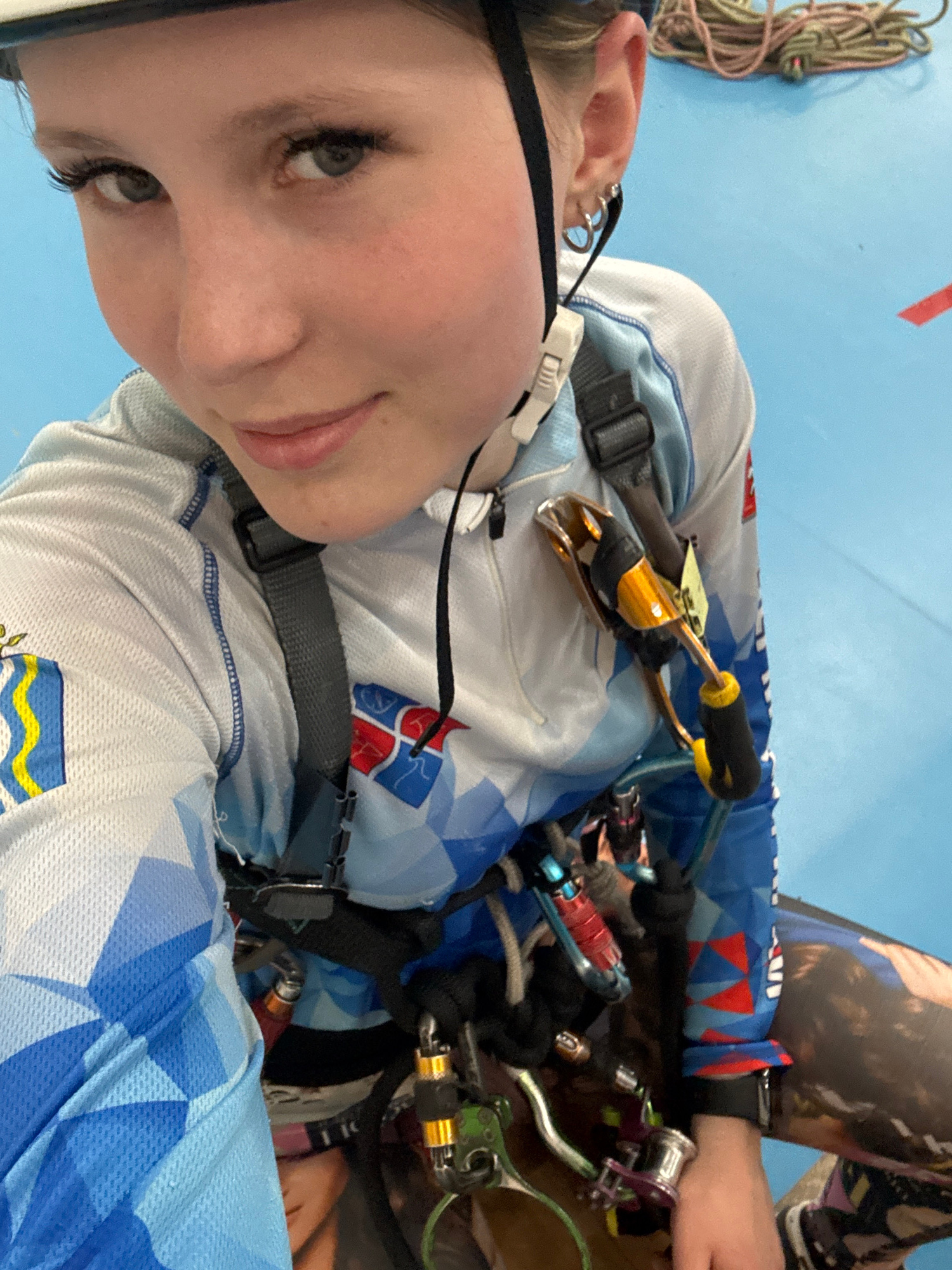 A selfie of a fair-skinned young woman wearing climbing gear and a blue and white patterned top. The climbing gear includes multiple carabiners and pulleys attached to a harness. The background is a l…read more