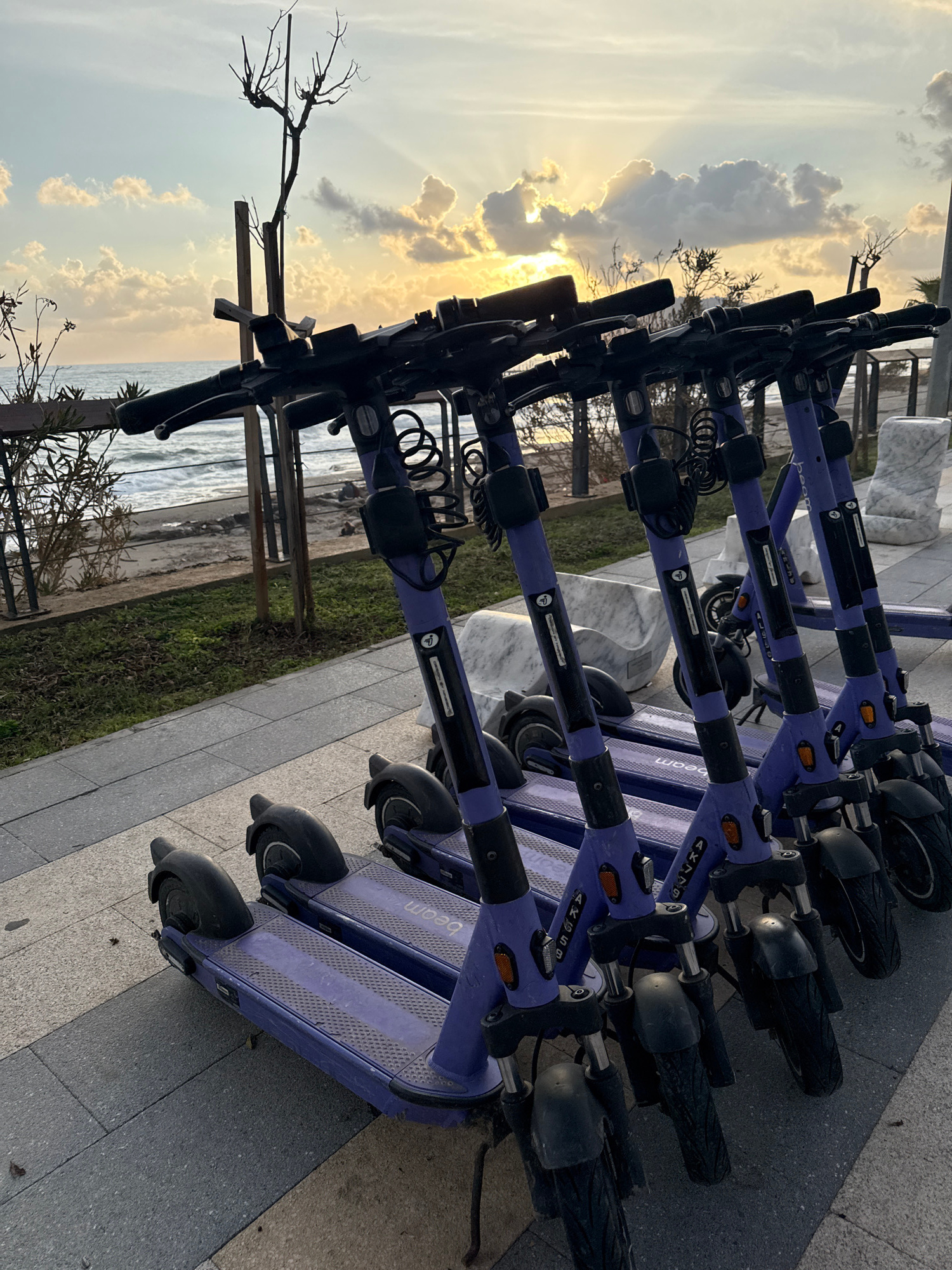 The image displays a line of at least six purple and black Beam electric scooters parked on a gray tiled sidewalk in Alanya, Turkey. Each scooter features "beam" branding on its footboard and identifi…read more