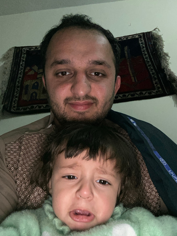 A man with short dark hair and a beard is looking at the camera. Next to him, a child with brown hair and a distressed expression is visible. The child appears to be wearing a green fuzzy outfit. Behi…read more
