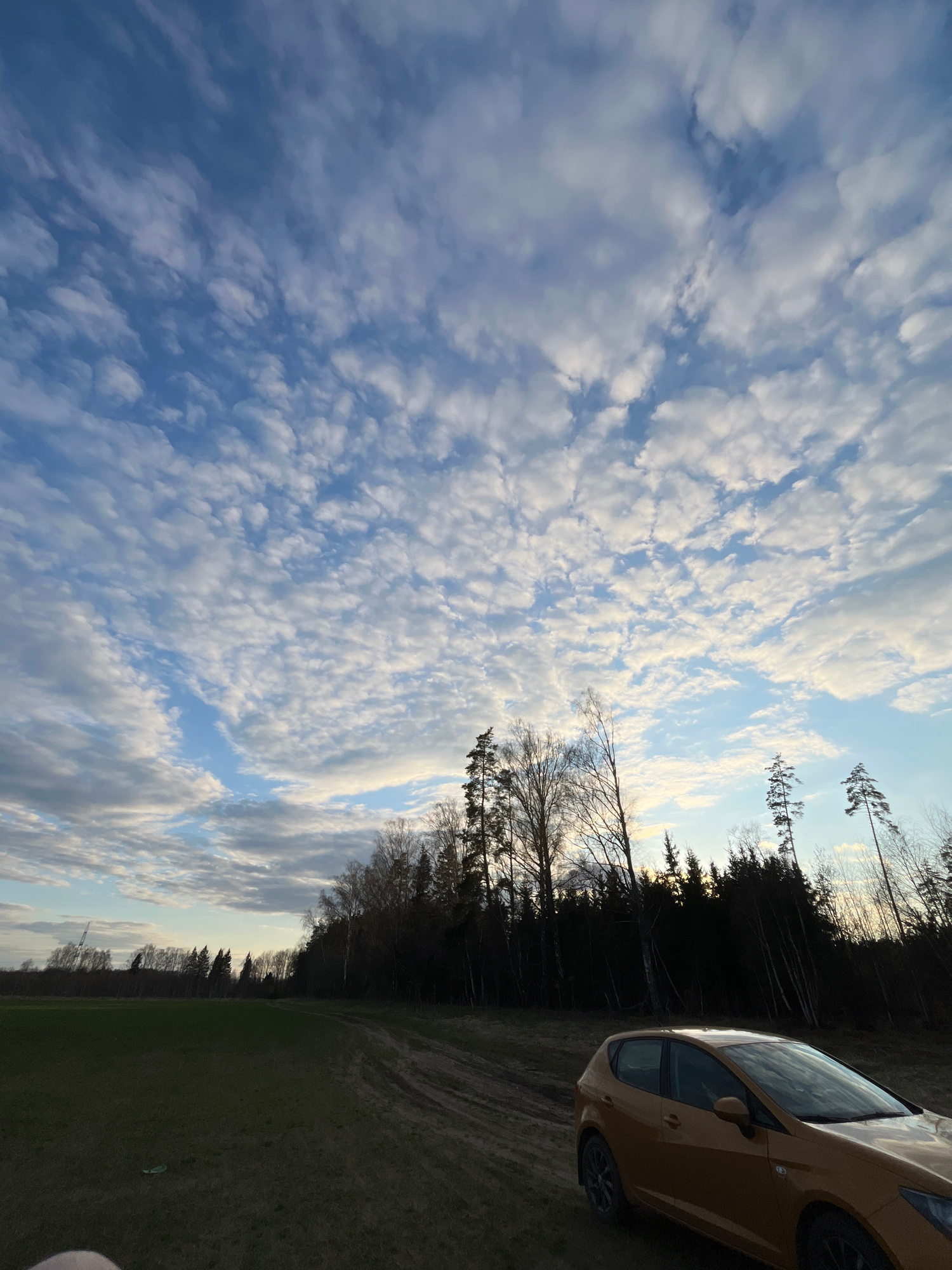The image shows a daytime scene in Раздолье, Russia. An expanse of sky filled with altocumulus clouds dominates the left portion. A forest edge is visible along the top and right sides, with some bare…read more