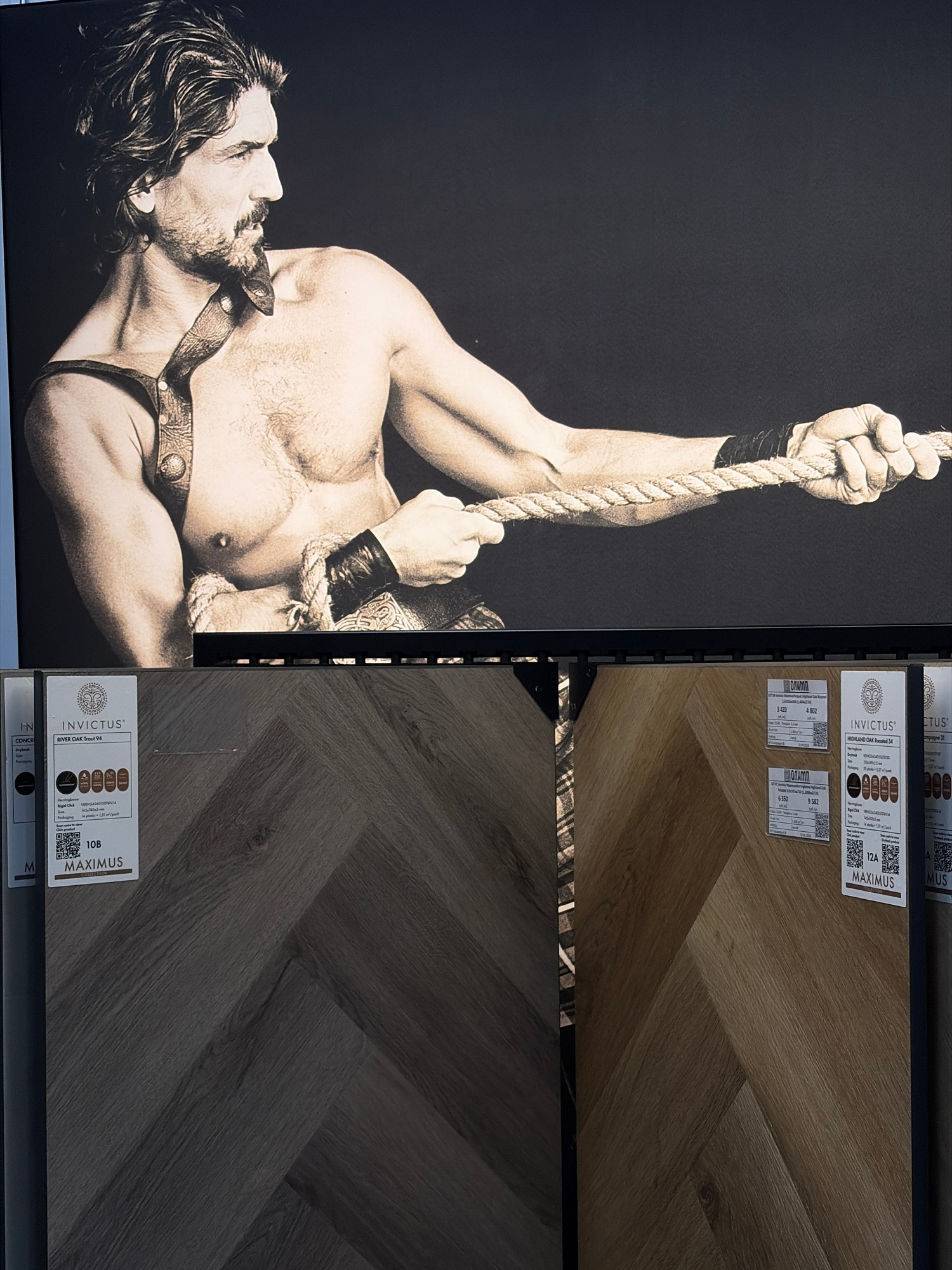 The image presents an advertisement for flooring materials, juxtaposed with an adjacent monochrome poster of a male figure. The man is depicted bare-chested, gripping a rope, and wearing a leather har…read more
