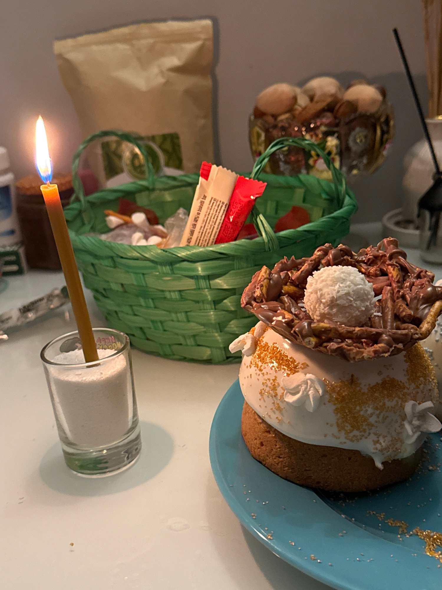 A still-life photograph depicts a partially-filled green woven basket containing items including candies and packaged food. The basket is situated next to a lit beeswax candle inside a clear glass con…read more