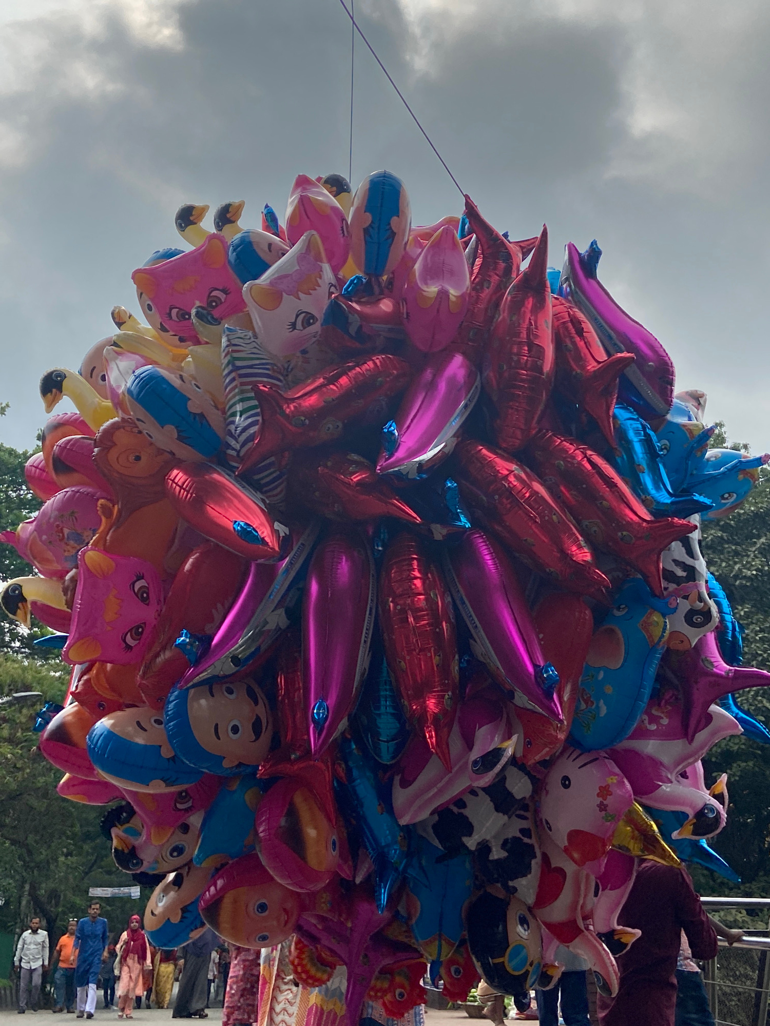 A large cluster of brightly colored novelty balloons is being held against a partly cloudy sky. The balloons include a mix of shapes and characters, such as dolphins, swans, cartoon faces, and animals…read more