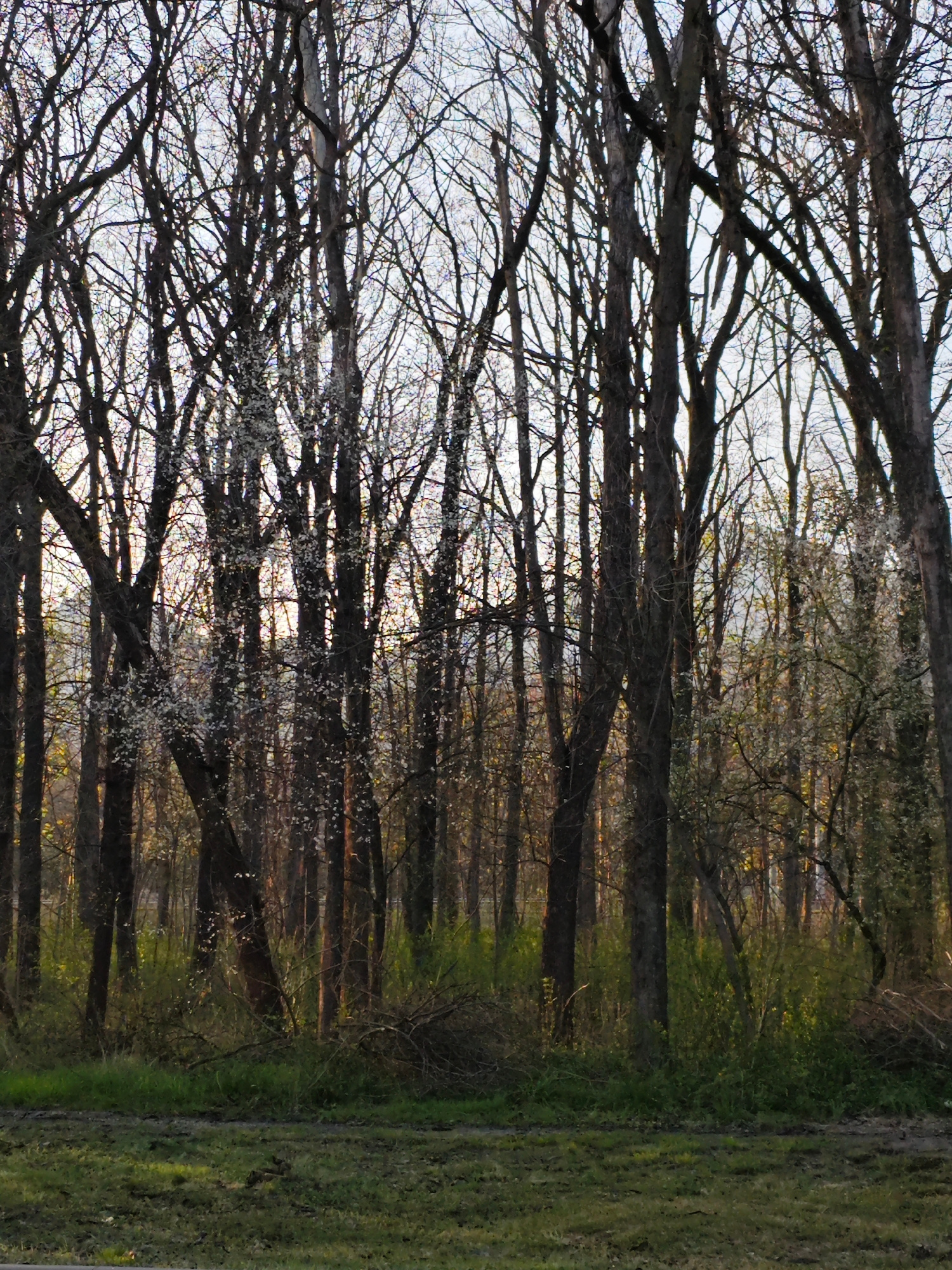 The image depicts a dense forest or wooded area. Many bare trees with dark trunks and branches dominate the scene. Some trees have small white blossoms, suggesting early spring. The undergrowth includ…read more