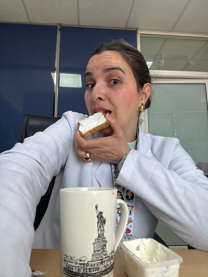 A woman is depicted seated at a desk in an office environment in Meknes, Morocco. She is wearing a white lab coat over a light green top, with a lanyard visible featuring cartoon faces and text. A larβ¦read more