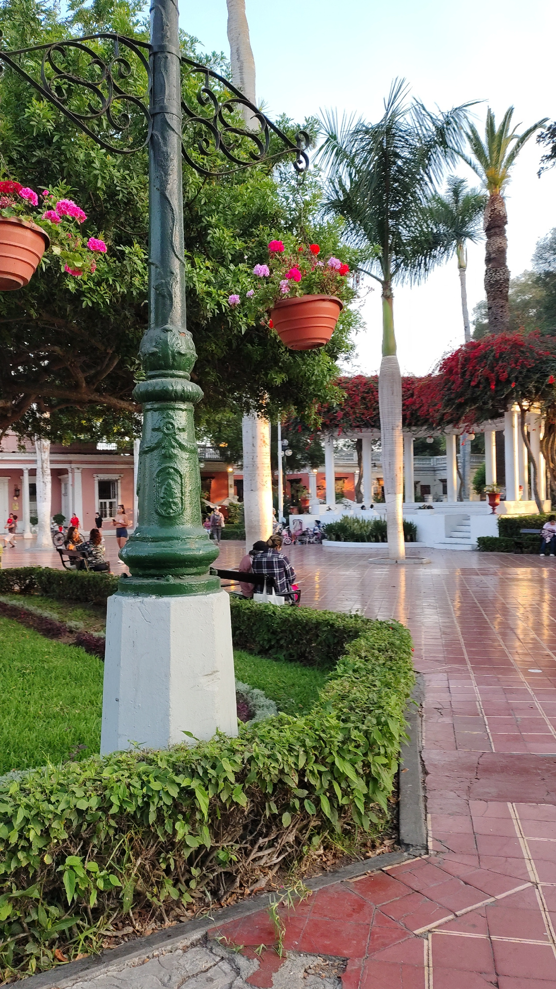 The image depicts a scene in Barranco, Peru. A green and white lamp post stands in the foreground, adorned with hanging flower pots. Beyond the lamppost is a view into a park with palm trees, flower-c…read more