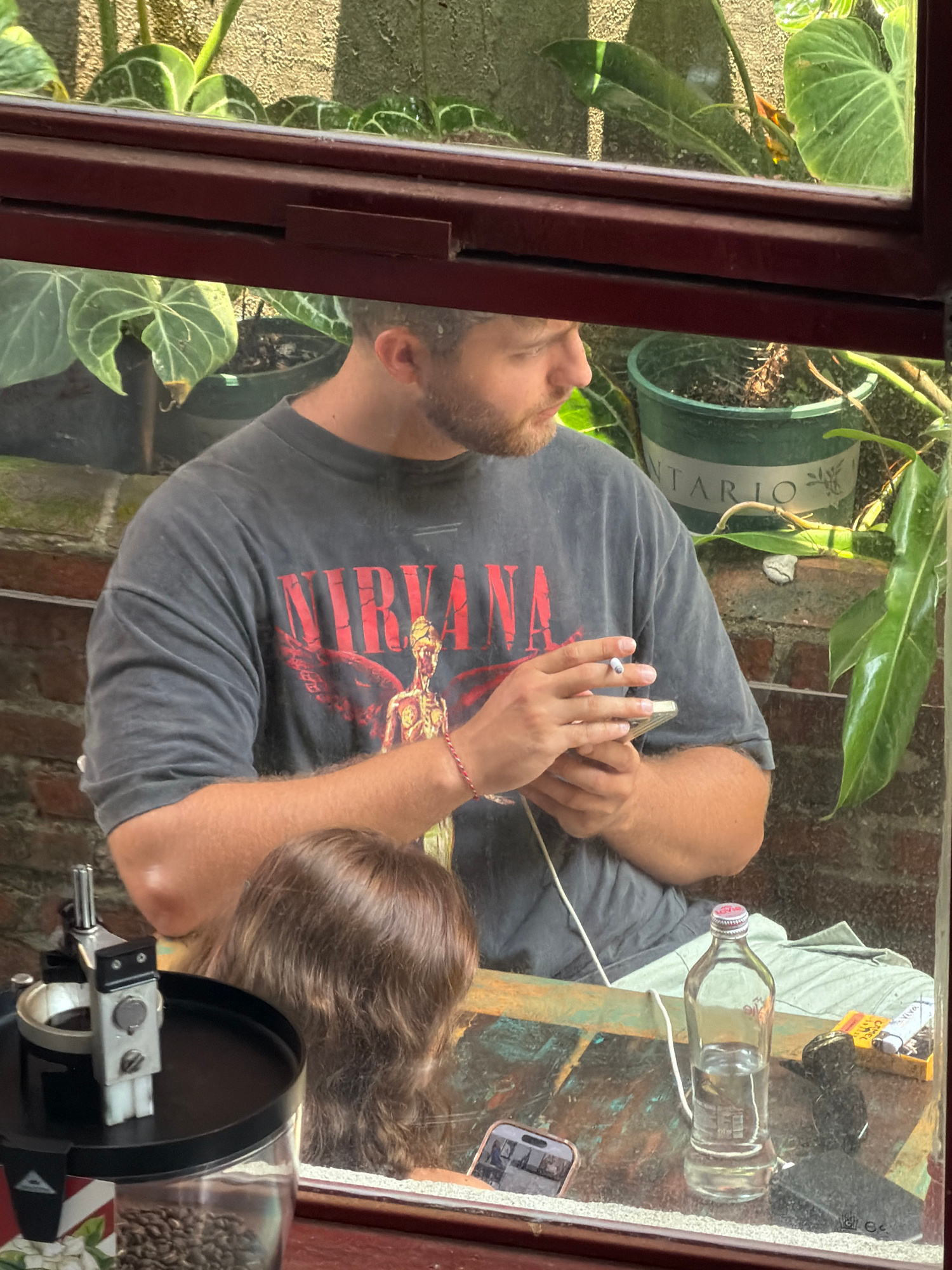 A bearded man wearing a gray t-shirt with "Nirvana" printed on it is seen through a window. He is holding a cigarette in his right hand. Beside him is a woman with wavy brown hair. On the table, there…read more