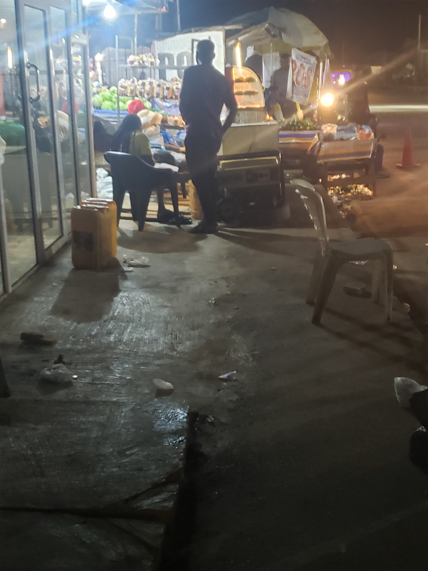 The image depicts an outdoor night market or street scene in Ibadan, Nigeria. The time of day is clearly night, with various artificial light sources illuminating the area, casting reflections on the…read more