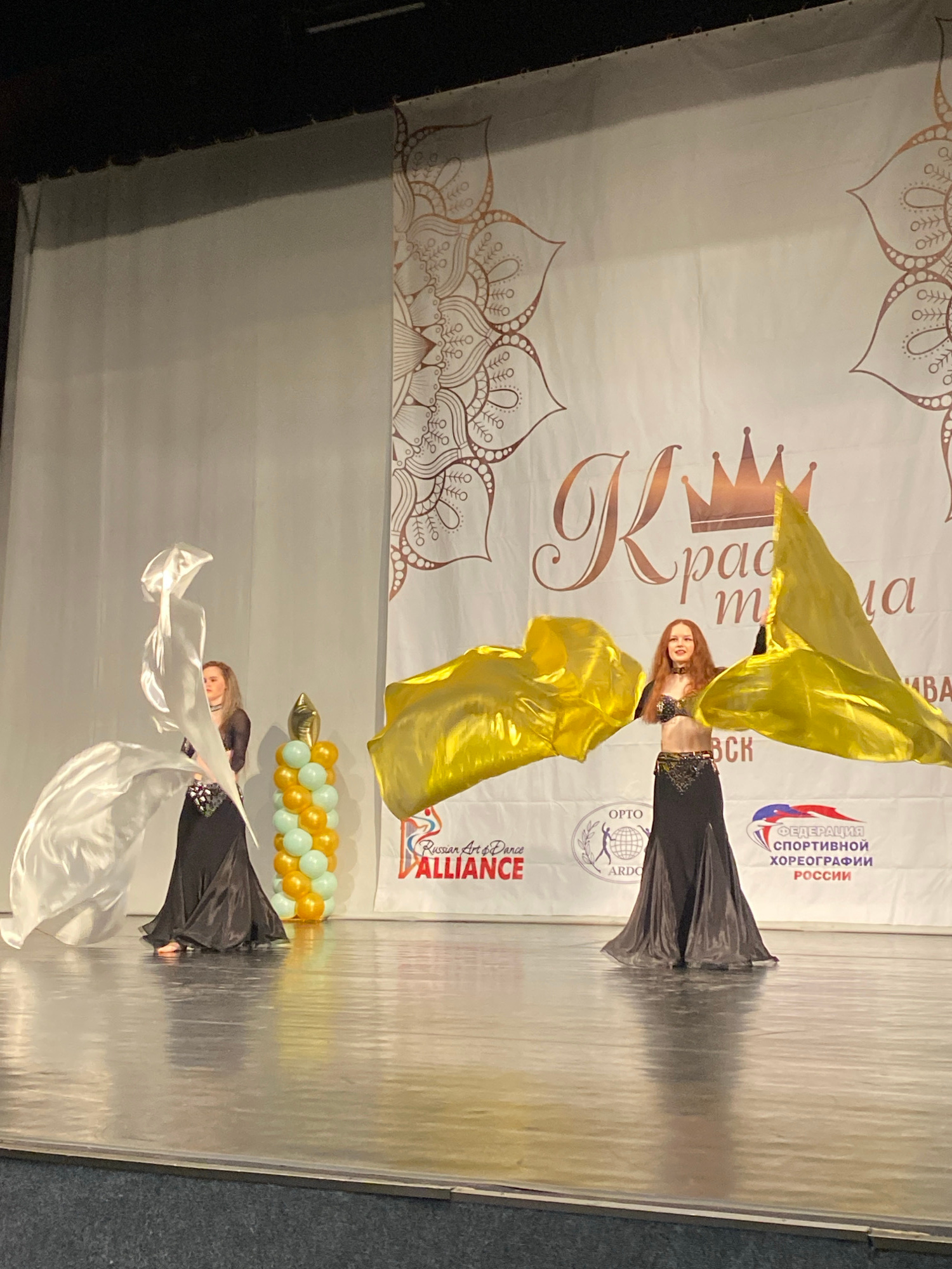 The image captures a stage performance, likely a dance competition, based on the banner visible in the background. Two women are on stage, dressed in belly dancing attire. The first woman is located t…read more