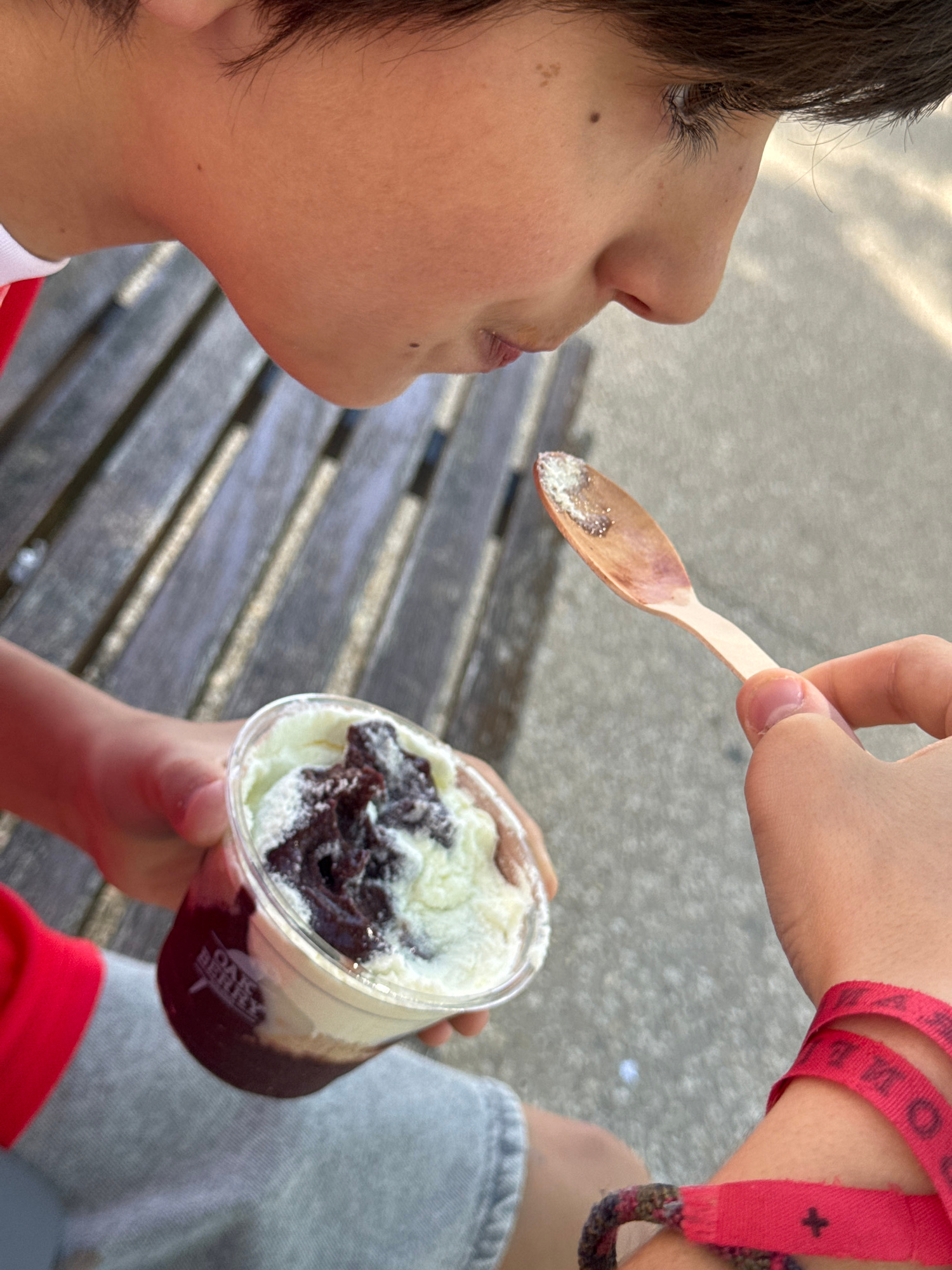 A person is being fed a spoonful of food, presumably a dessert like ice cream or yogurt, from a plastic cup. The person being fed is in the lower left, facing to the right. An arm and hand holding a s…read more