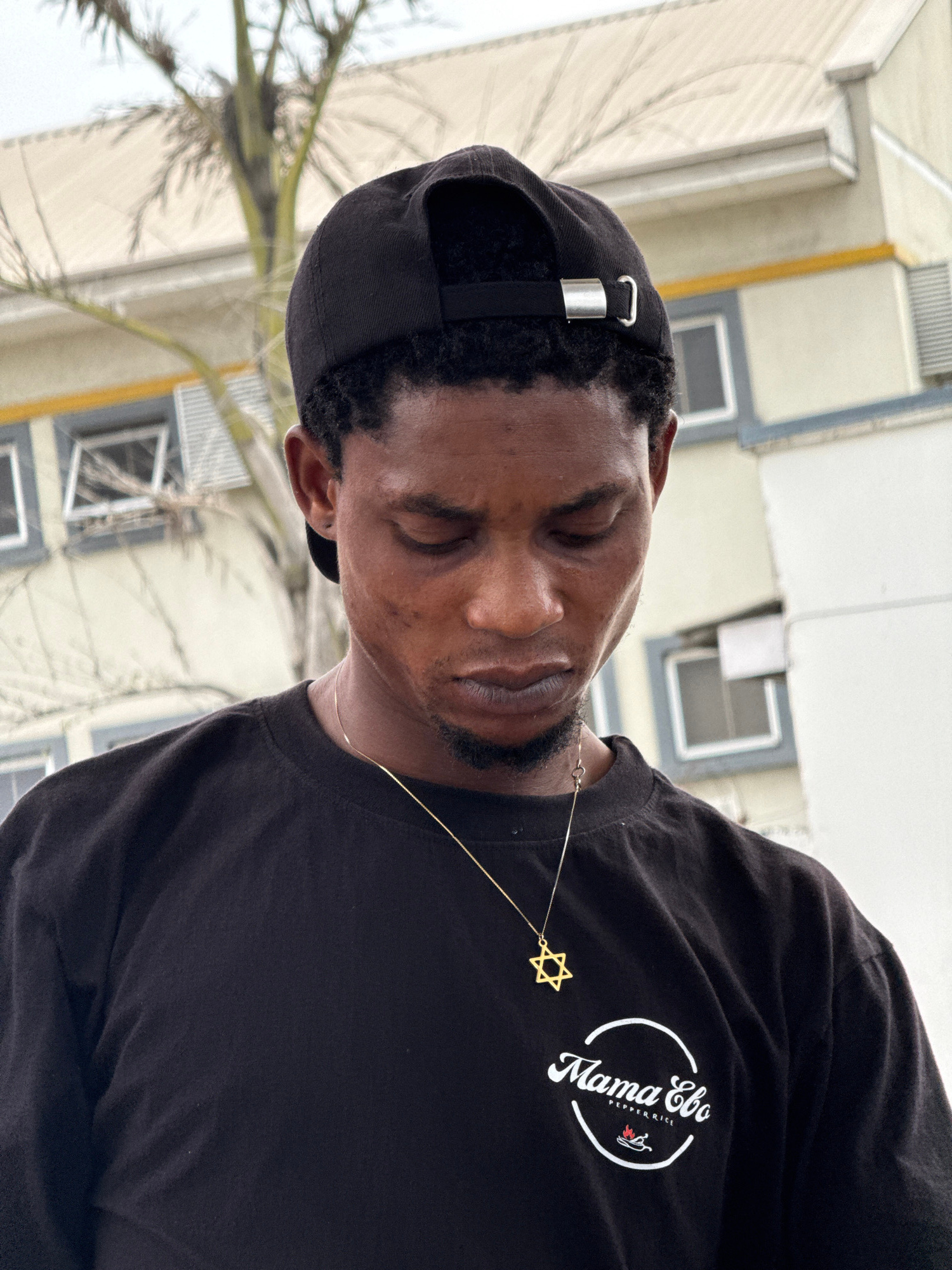 A man with dark skin and closed eyes wears a black t-shirt with the white words "Mama Ebo Pepper Rice" printed on it in a circular logo. He also wears a black baseball cap and a gold Star of David nec…read more