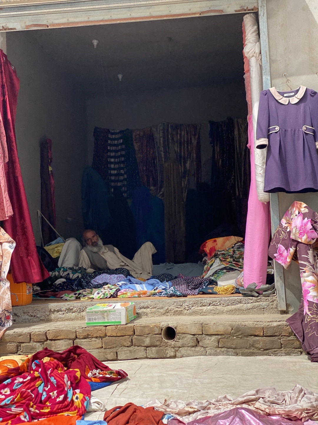 The image depicts an open-fronted shop or building in Kandahar, Afghanistan. An elderly man with a white beard is lying among piles of colorful fabric and clothing inside the darkened interior. More f…read more