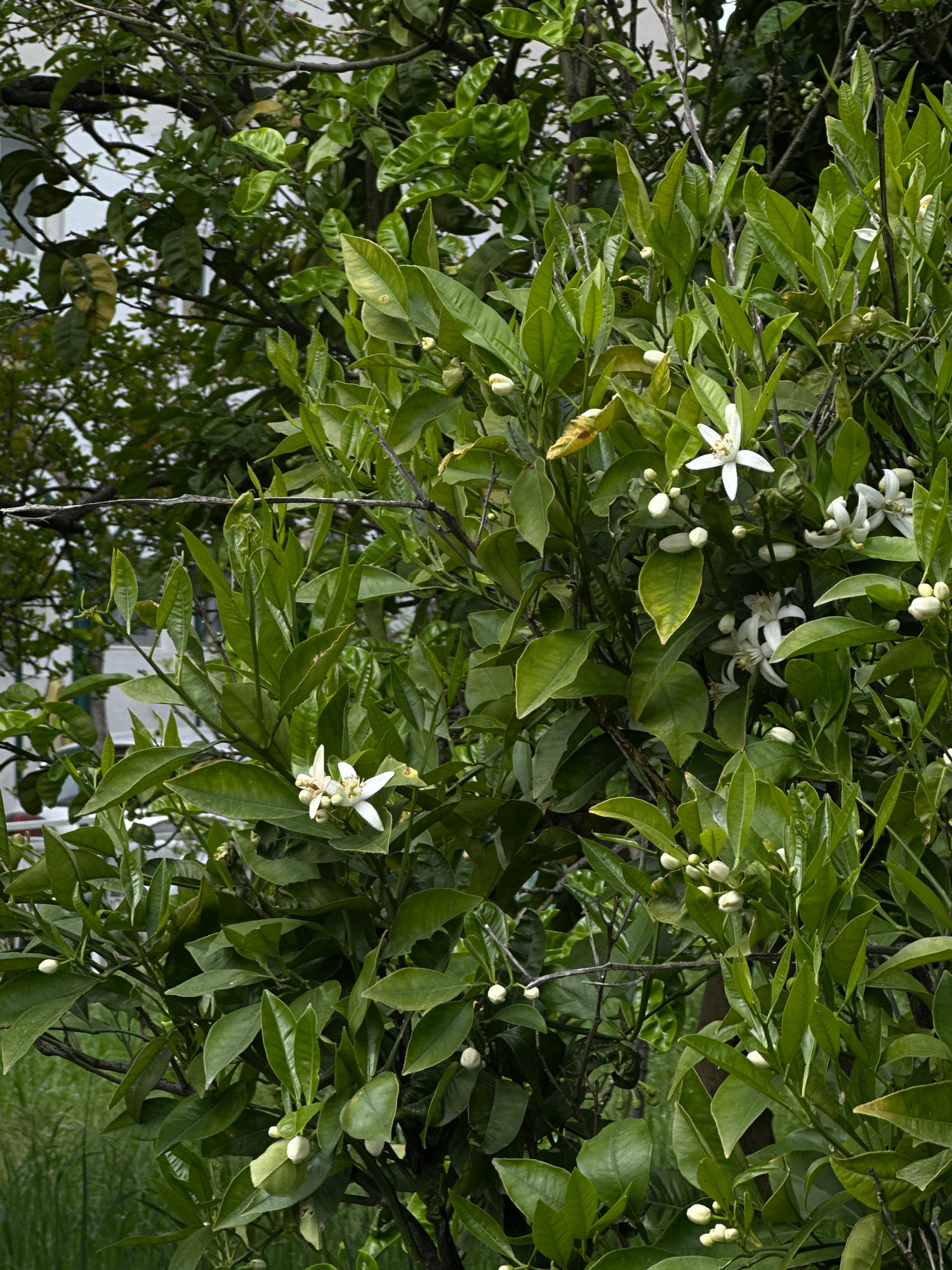 The image shows an orange tree with white flowers and green leaves. It is likely located in Šušanj, Montenegro, given the user's request. No people are visible. The dominant elements are the flora; sp…read more
