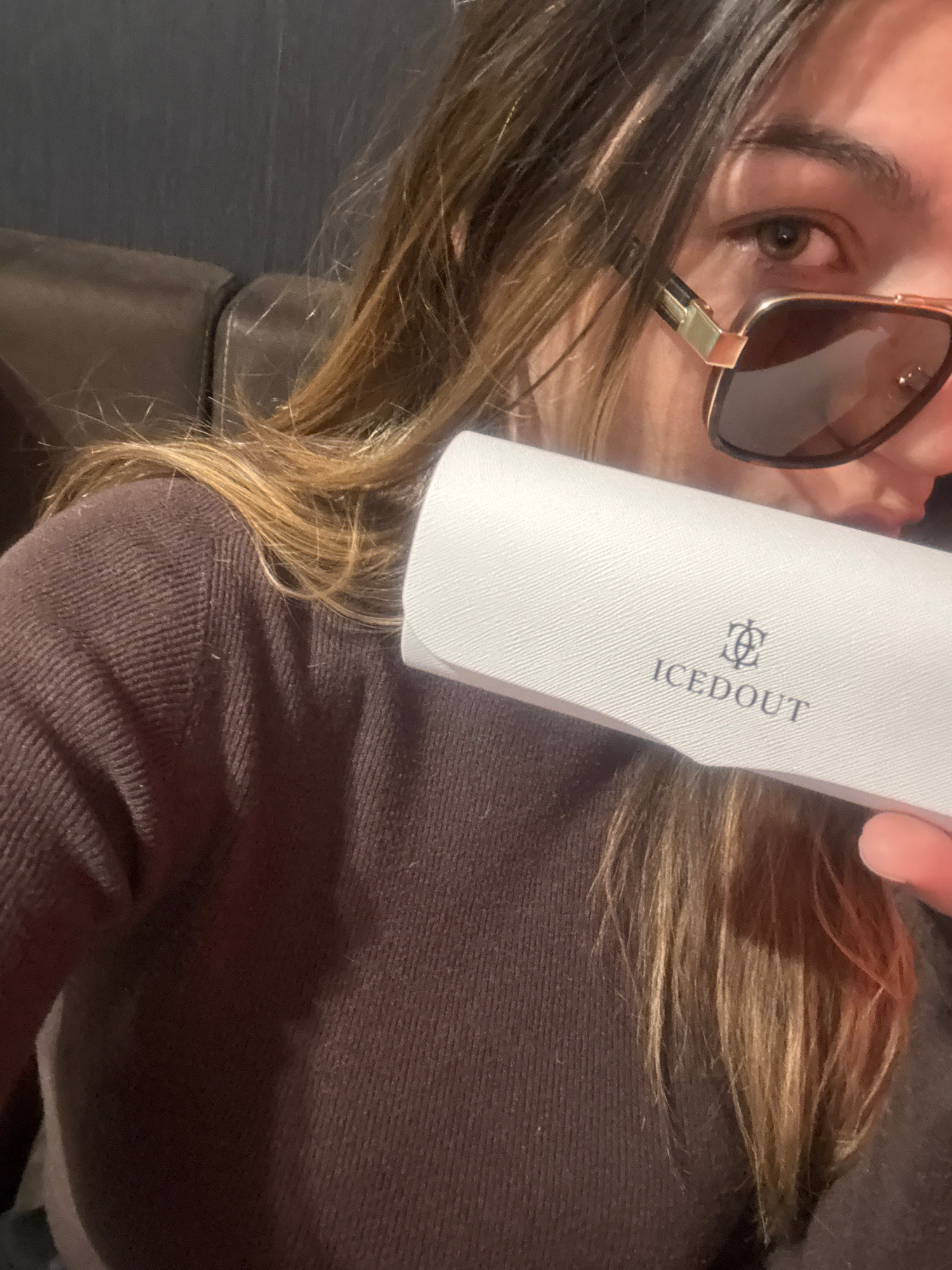 A person with brown and blonde hair is holding a white sunglasses case in front of them. The case has the logo "ICEDOUT" printed on it. The person is wearing sunglasses with a gold frame. The backgrou…read more