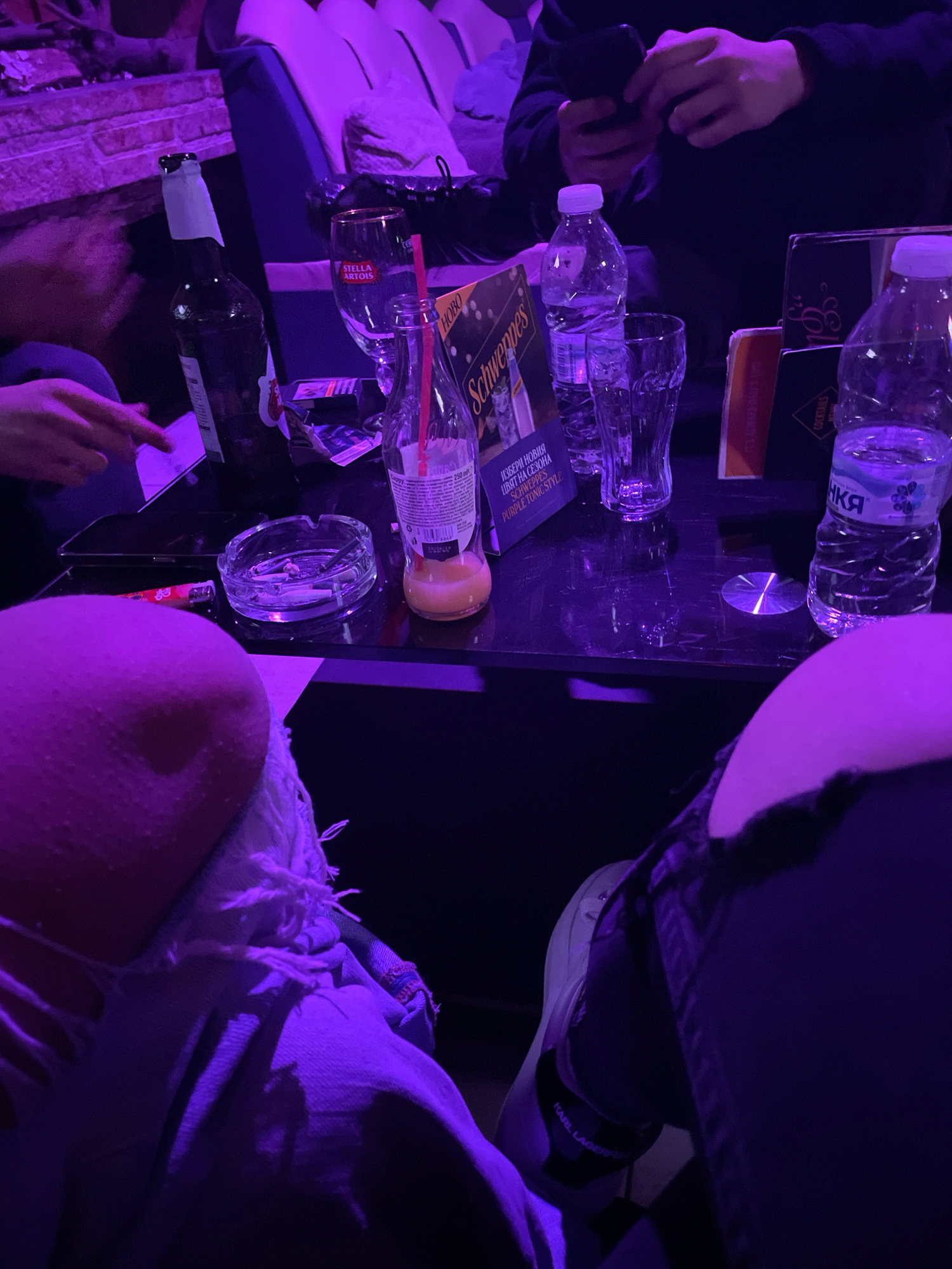The image appears to be a nightlife scene, likely indoors at a bar or club with heavy purple lighting. The primary focus is a black table covered with various items including empty water bottles (one…read more