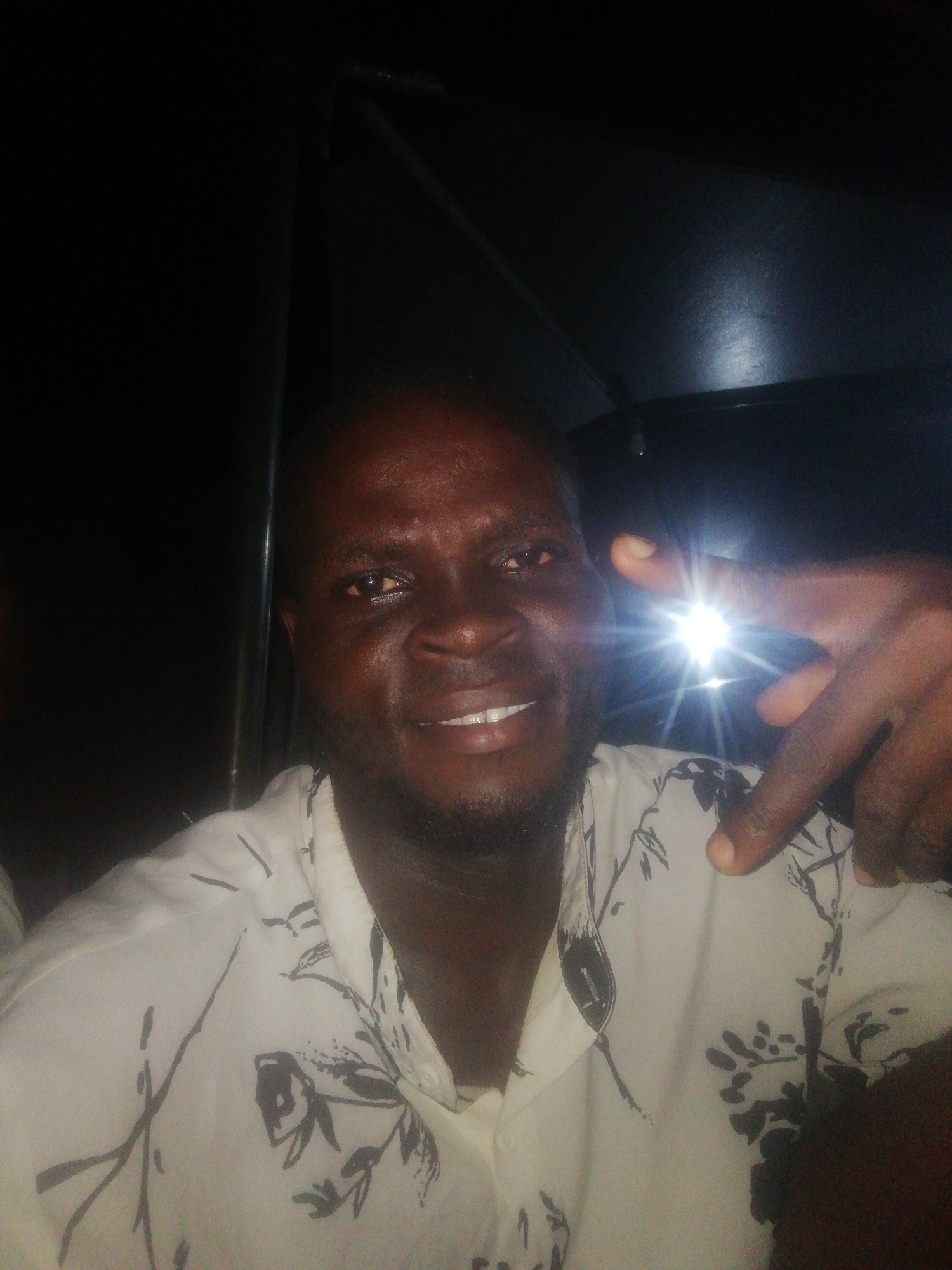 An individual is posing for a selfie in a dimly lit environment. The person is wearing a white shirt patterned with dark, floral designs. The person's fingers are raised and appear to be creating a peace sign, with the bright flash reflecting off the fingers. The background is dark and indistinct, except for a metallic bar appearing in the upper section of the photo. Based on the prompt, it is suggested the location of the photo is Ikorodu, Nigeria. | Open Wire