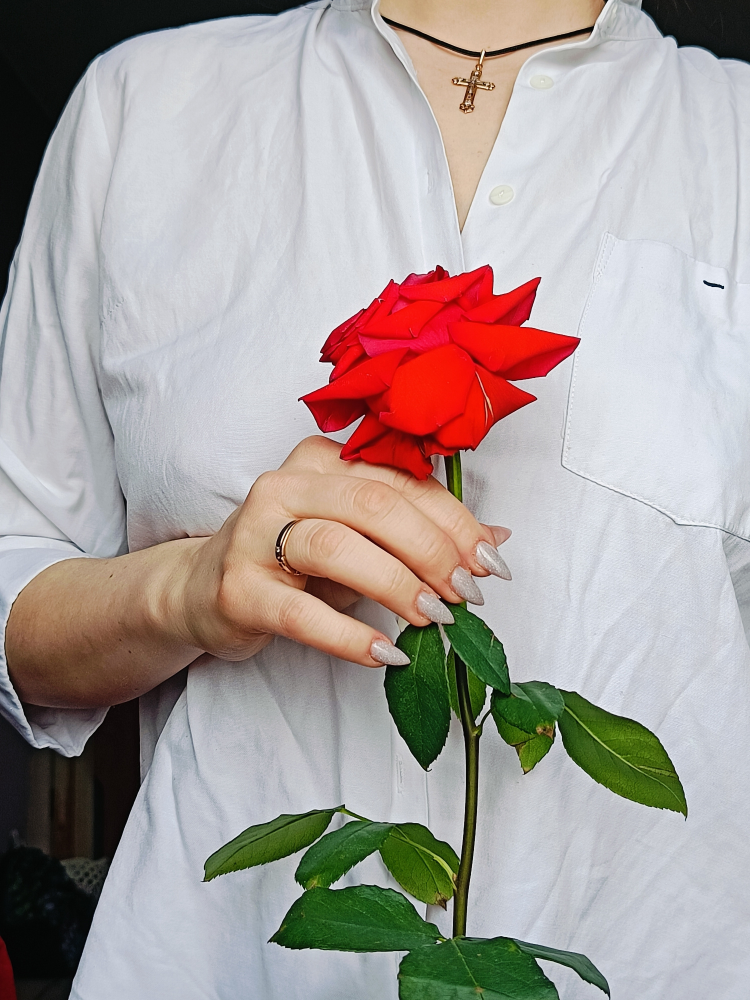 A person is holding a red rose. The person is wearing a white button-down shirt, a black choker with a gold cross pendant, and a gold ring. The rose has green leaves and a long stem. The person's fing…read more