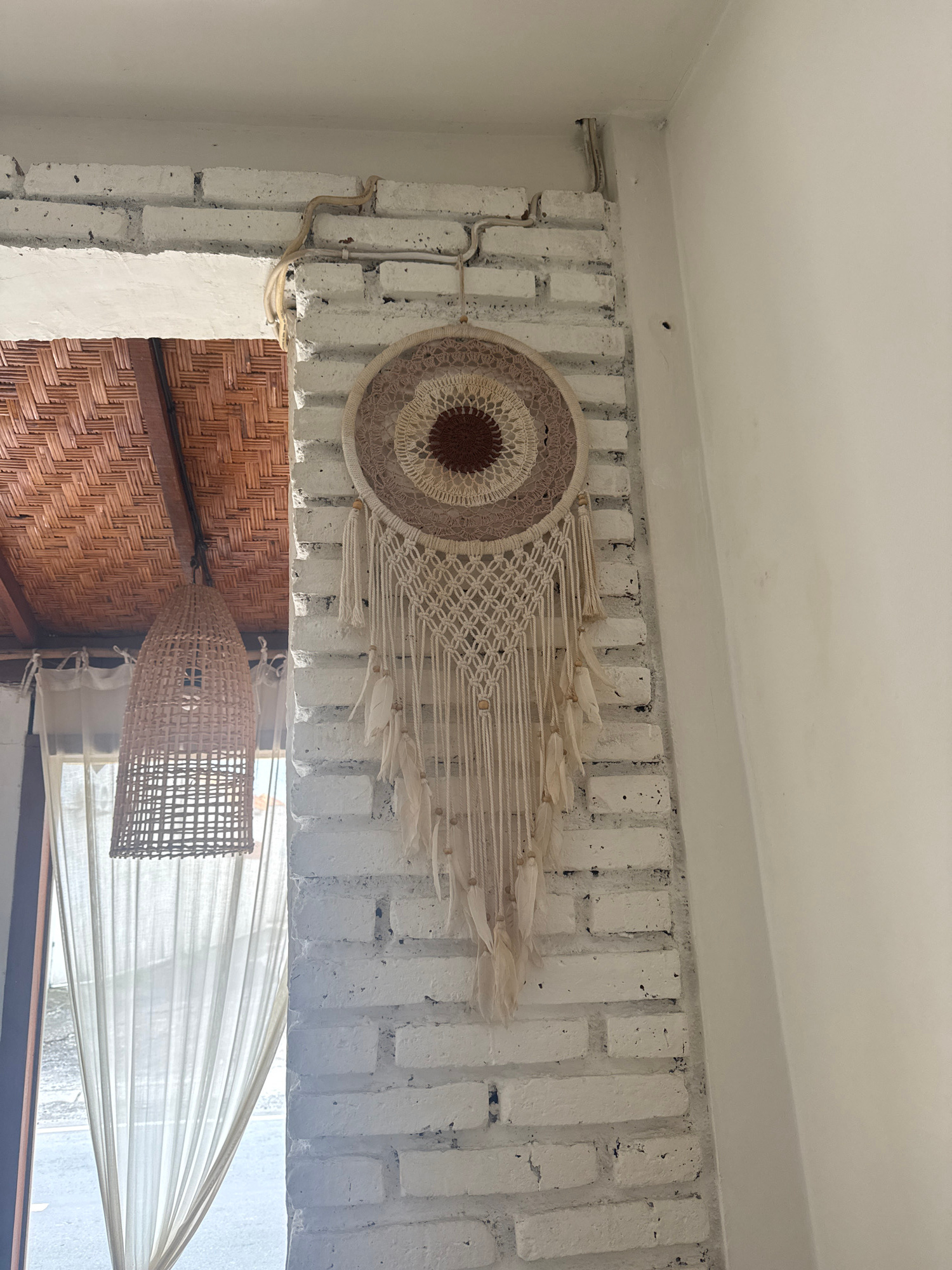 The image shows a portion of the interior of a building in North Kuta, Indonesia. A white-painted brick wall supports a macrame wall hanging featuring a circular woven center and hanging strands. Belo…read more