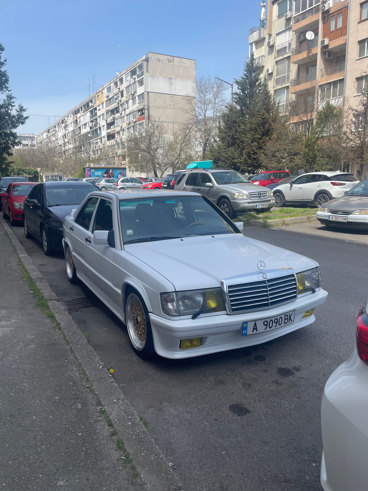 The image shows a street in a city, likely Burgas, Bulgaria, based on the license plate. A white Mercedes-Benz is parked on the right side of the street. A series of other cars are parked behind it, i…read more