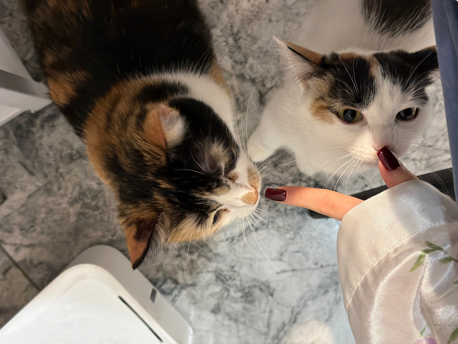 A high-angle, close-up photograph shows two cats with a hand extended towards one of them. The cat on the left has calico fur with black, brown, and white patches. Its head is tilted slightly down, anβ¦read more