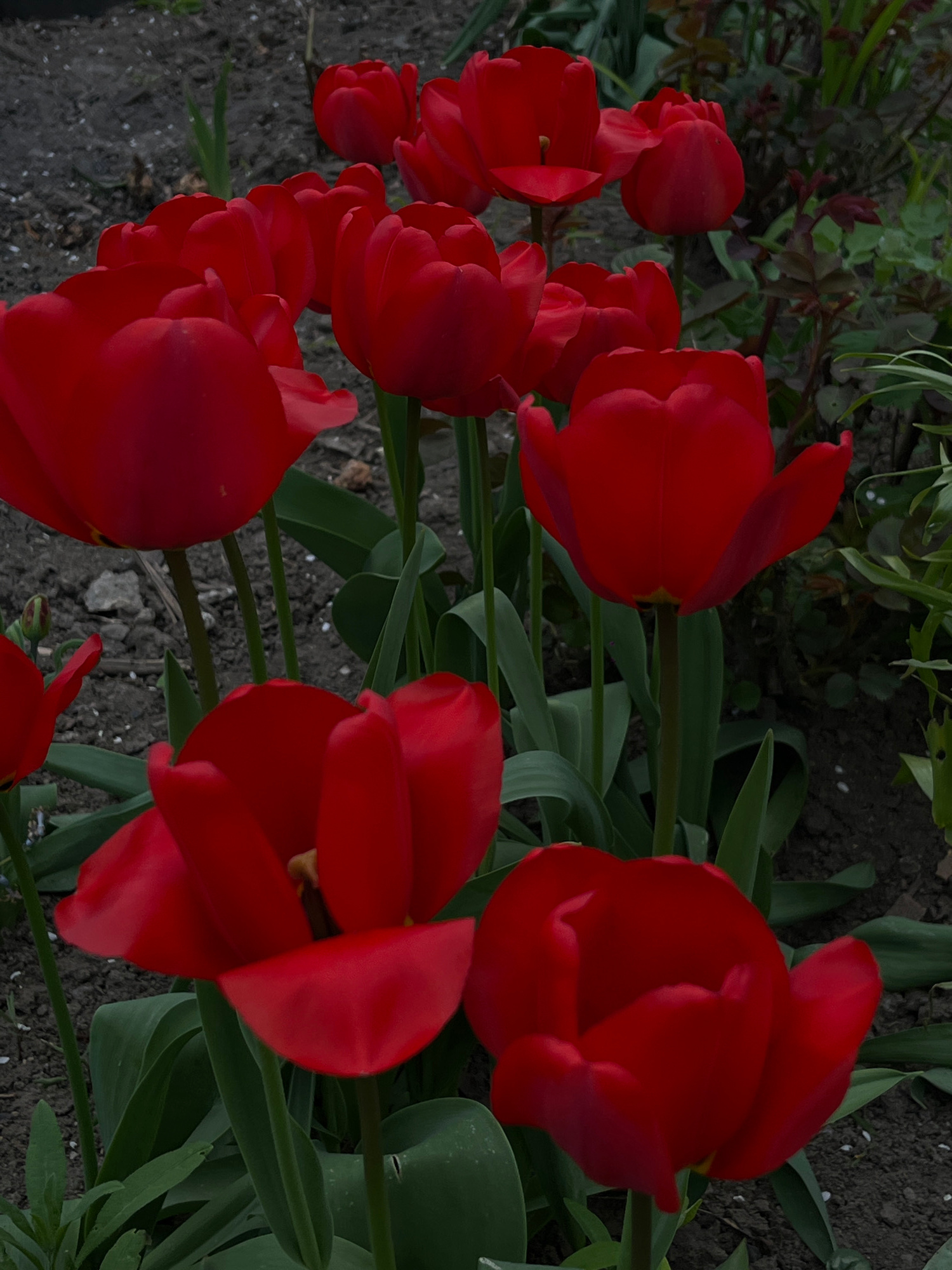This media file captures a close-up, slightly overhead view of several vibrant red tulips blooming in a garden, likely in Novopokrovskaya, Russia. The scene is dominated by the rich, deep red petals o…read more